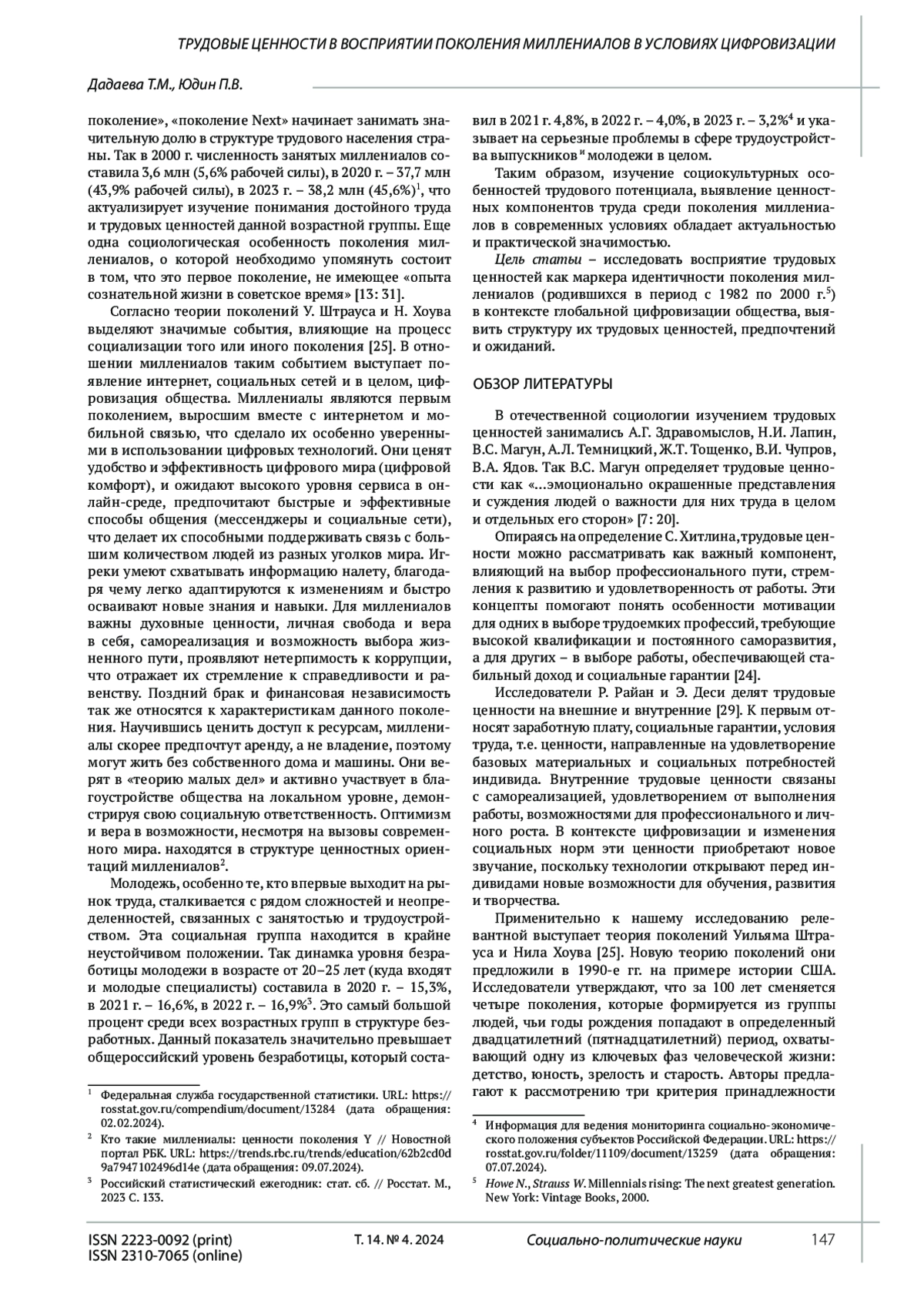 Цель статьи - исследовать восприятие трудовых ценностей как маркера идентичности поколением миллениалов в контексте глобальной цифровизации общества. Поколение миллениалов, выступая значительной частью экономически активного населения страны, демонстрирует свое понимание достойного труда, выражающееся в трудовых предпочтениях и ценностных ориентаций, что, в свою очередь, служит для определения идентичности данной возрастной группы. Цифровизация внесла свой вклад в развитие и диверсификацию сектора занятости, предложив альтернативные формы, что во многом изменило понимание достойного труда. На основе данных социологического исследования, формализованных интервью среди представителей поколения миллениалов (n = 300) выявлены ключевые составляющие трудовых ценностей и их влияние на профессиональную активность представителей изучаемого поколения. Установлено, что для миллениалов наибольшую ценность при выборе места работы имеет возможность карьерного роста и признание профессиональных качеств, а также хороший микроклимат в коллективе, на третьей позиции - уровень заработной платы. Выявлено, что в качестве трудовых преимуществ у миллениалов выступают возможность удаленной работы, предоставление полиса добровольного медицинского страхования (ДМС) и бесплатного питания. Игреки демонстрируют высокую адаптивность к меняющимся условиям трудового рынка и открытость к инновациям в организации трудового процесса, что проявилось в предпочтении удаленных форм занятости, возможности для переобучения и развития. Следовательно, можно говорить о балансе между внешними и внутренними трудовыми ориентациями для данного поколения. В перспективе можно исследовать в сравнительном аспекте отношение к труду миллениалов и центиниаллов. Результаты статьи представляют интерес для специализирующихся в области социологии труда и социологии молодежи. Данные социологического исследования могут быть использованы в практической организации трудовой деятельности по оптимизации управления персоналом и формирования корпоративной культуры, отвечающей запросам нового поколения работников.