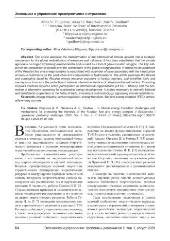 В статье проанализирована трансформация международной климатической повестки в стратегический механизм глобального перераспределения ресурсов и влияния. Установлено, что климатическая повестка перестаёт быть исключительно природоохранной и используется как инструмент геоэкономической борьбы. Ключевым предметом соперничества становится контроль над архитектурой глобального энергобаланса, в условиях которого развитие топливно-энергетического комплекса России сопряжено с рядом рисков, связанных с вводом различных ограничений на производство и потребление углеводородов. В статье проведена оценка угроз и ограничений, с которыми сталкиваются российские экспортеры энергетических ресурсов на внешних рынках, а также определены инструменты и механизмы обеспечения защиты национальных интересов в условиях климатически мотивированных барьеров. Сделан вывод, что защита интересов России требует активного участия в международных объединениях (ОПЕК+, БРИКС) и продвижения альтернативных сценариев устойчивого энергетического развития. Также необходима активизация двустороннего и многостороннего сотрудничества в сферах торговли, инвестиций и технологий в обход климатических ограничений.
