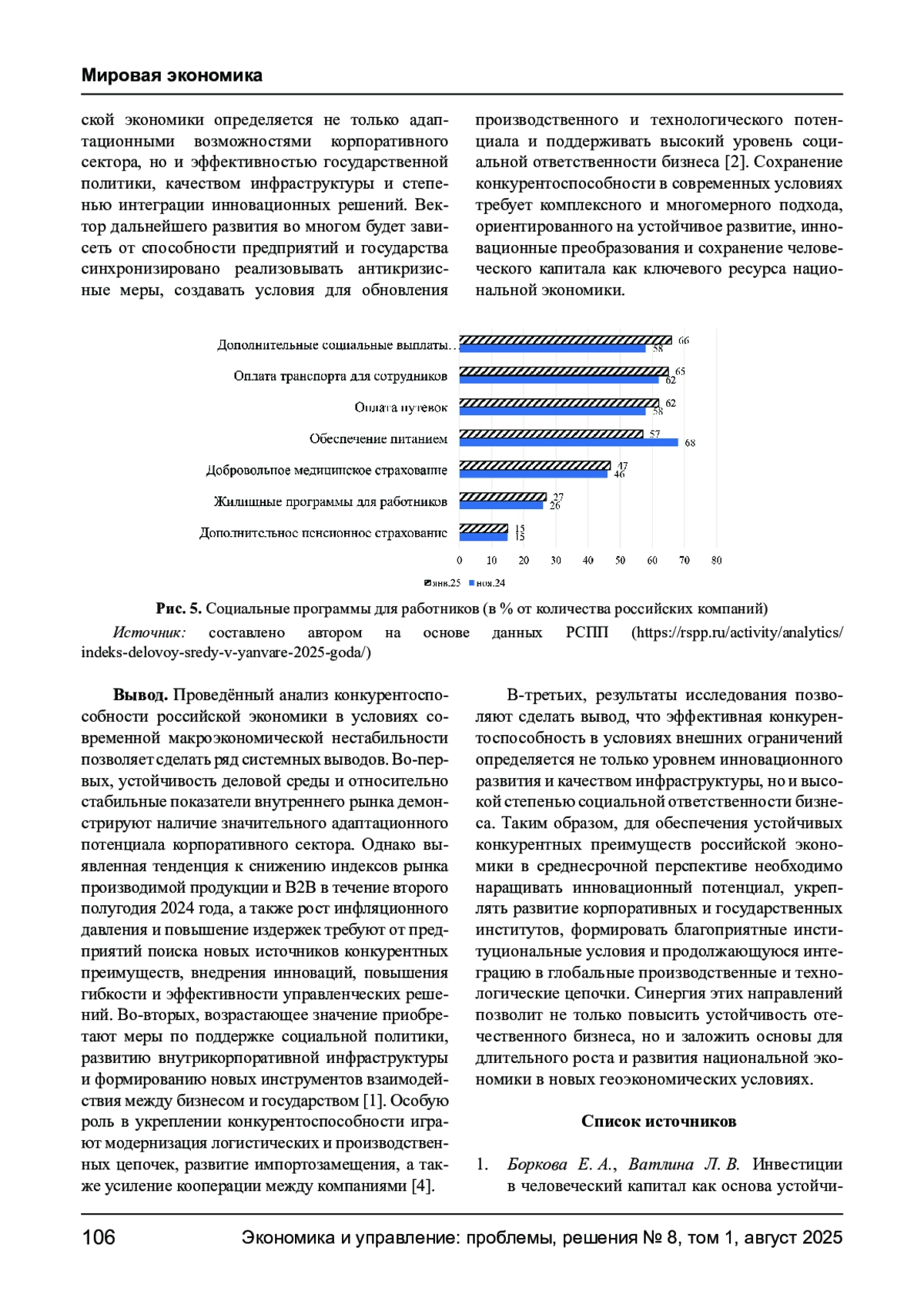 1. Боркова Е. А., Ватлина Л. В. Инвестиции в человеческий капитал как основа устойчивого социально-экономического развития // Экономика и управление. 2025. Т. 31, № 1. С. 13-22. EDN: RQHLSS