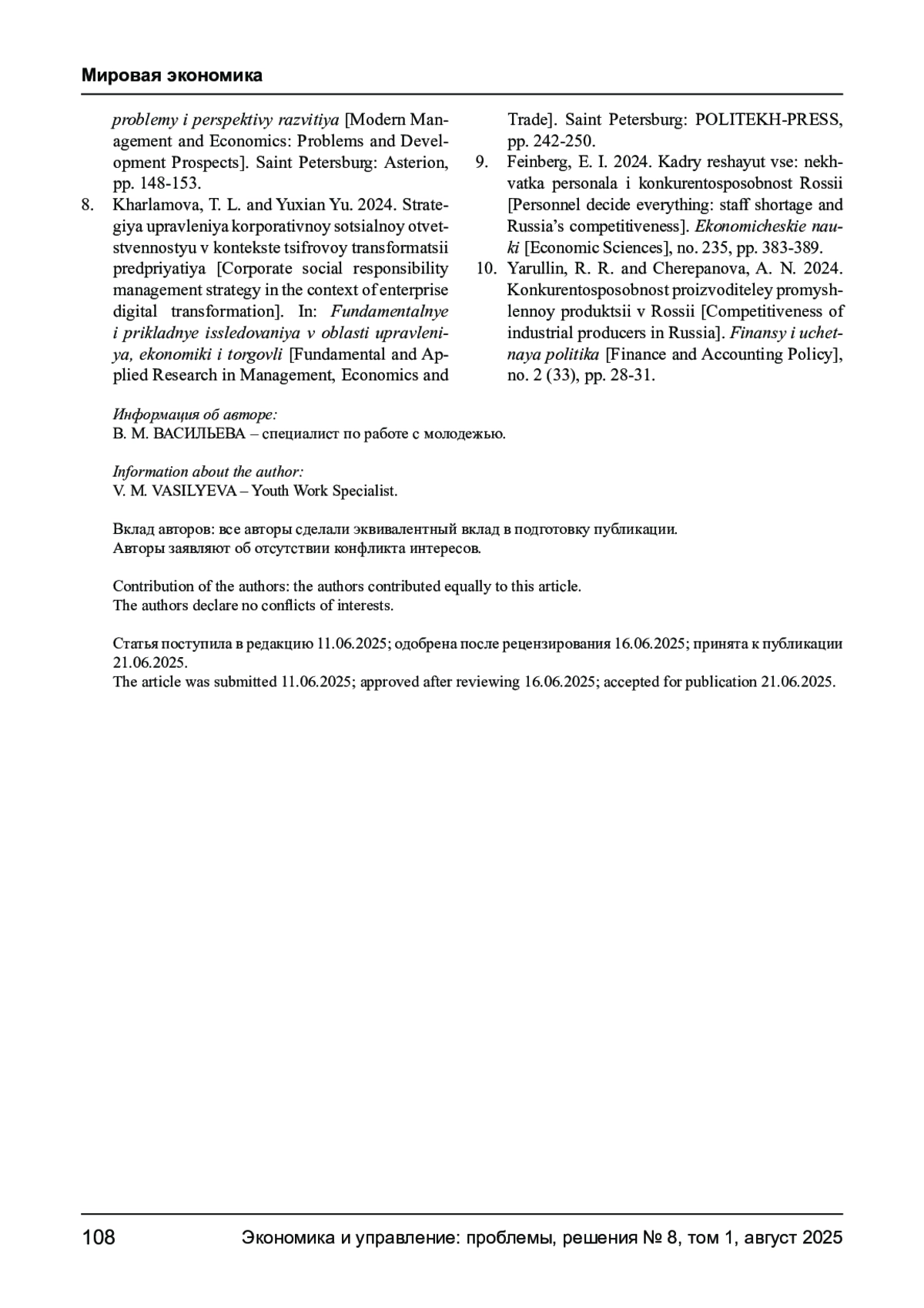 9. Файнберг Е. И. Кадры решают все: нехватка персонала и конкурентоспособность России // Экономические науки. 2024. № 235. С. 383-389.