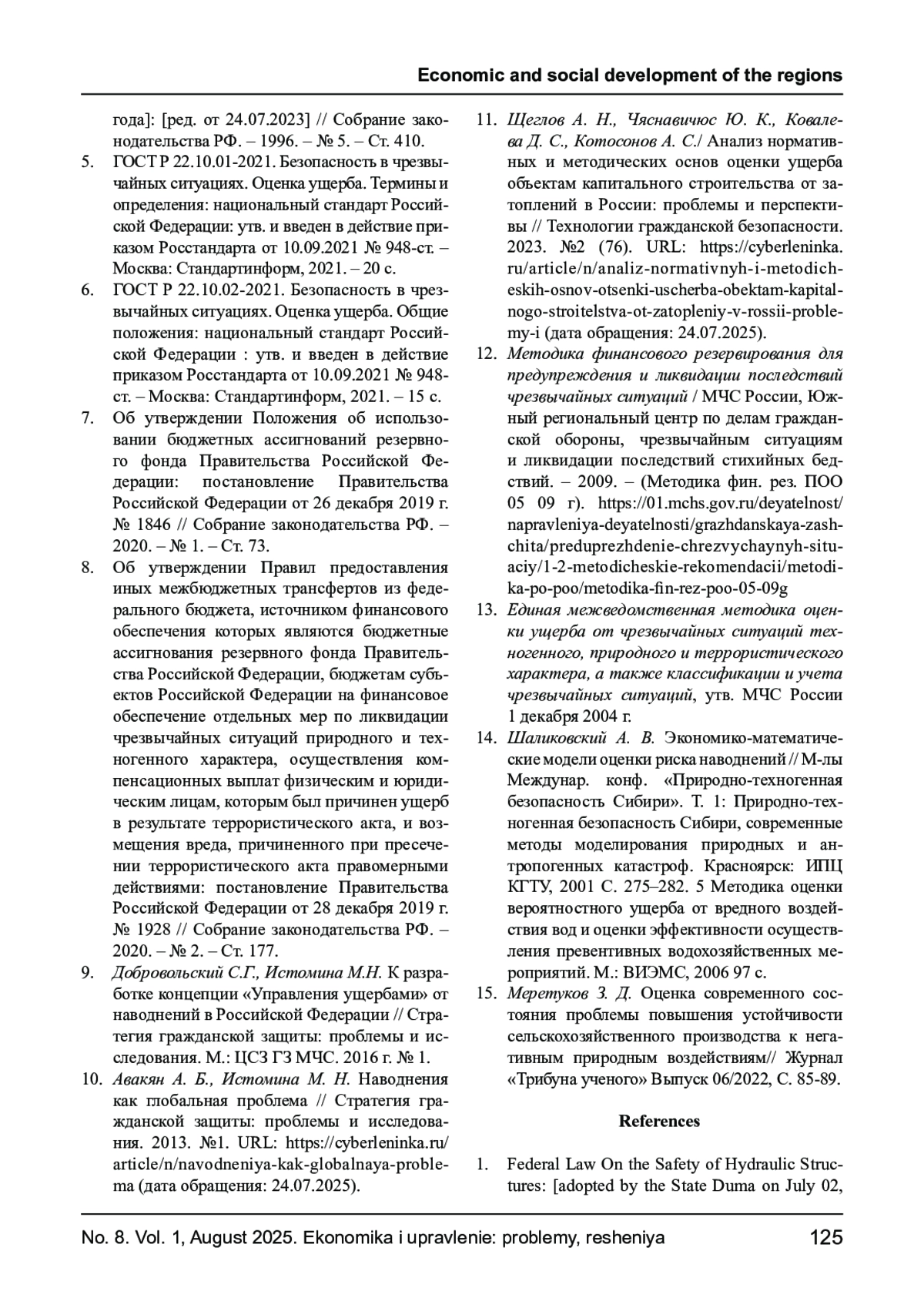 11. Щеглов А. Н., Чяснавичюс Ю. К., Ковалева Д. С., Котосонов А. С./ Анализ нормативных и методических основ оценки ущерба объектам капитального строительства от затоплений в России: проблемы и перспективы // Технологии гражданской безопасности. 2023. №2 (76). URL: https://cyberleninka.ru/article/n/analiz-normativnyh-i-metodicheskih-osnov-otsenki-uscherba-obektam-kapitalnogo-stroitelstva-ot-zatopleniy-v-rossii-problemy-i (дата обращения: 24.07.2025). EDN: USVAJF