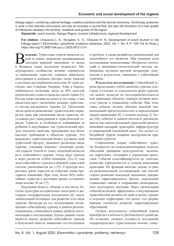 Событийный туризм является одним из наиболее динамично развивающихся направлений туристической индустрии. В статье рассматриваются современные тенденции развития событийного туризма в Калужской области, анализируются ключевые мероприятия, их влияние на туристский поток и экономику региона. На основе анализа научной литературы, статистических данных и наблюдения выявлены основные драйверы и барьеры развития данного вида туризма. Сделан вывод, что событийный туризм выступает важнейшим элементом стратегии развития Калужской области, объединяя культурное наследие, креативные практики и туристскую экономику. Продолжение системной работы в этом направлении обеспечит не только рост туристского потока, но и формирование нового качества взаимодействия между территорией, жителями и гостями региона.