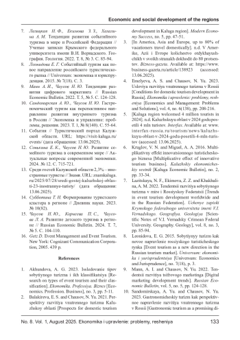 7. Лазицкая Н. Ф., Екимова З. З., Хахалина А. М. Тенденции развития событийного туризма в мире и Российской Федерации // Ученые записки Крымского федерального университета имени В.И. Вернадского. География. Геология. 2022. Т. 8, № 3. С. 85-94. EDN: ALGRKZ