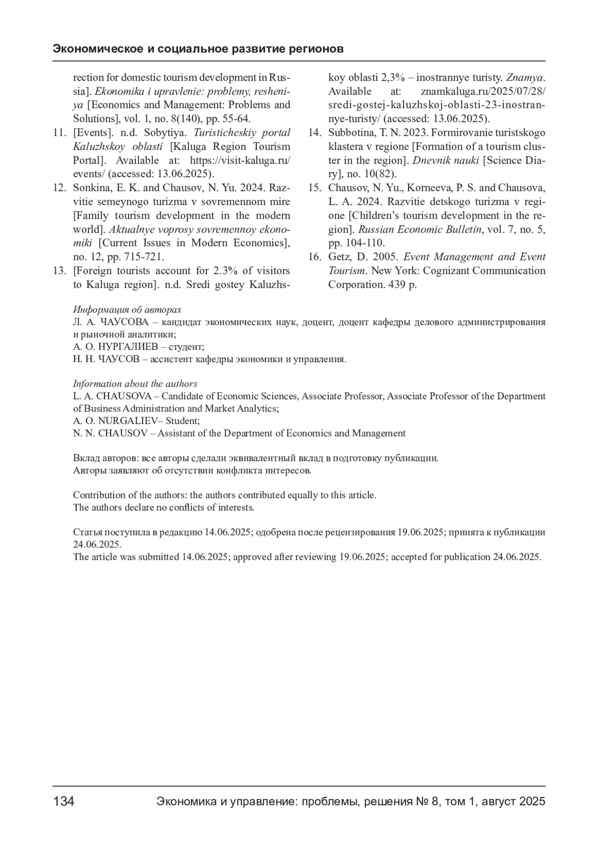 15. Чаусов Н. Ю., Корнеева П. С., Чаусова Л. А. Развитие детского туризма в регионе // Russian Economic Bulletin. 2024. Т. 7, № 5. С. 104-110. EDN: UYCAEM