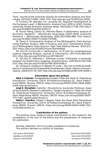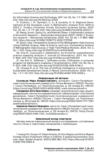 Заключение. Проведенный в рамках исследования библиометрический анализ позволил выявить ключевые направления научных работ в области эконометрического моделирования регионального развития. Разработанный авторами алгоритм и методология системного анализа библиографии дали возможность определить наиболее значимые и весомые научные труды в рассматриваемой области. Представленные разнообразные визуализации данных проиллюстрировали междисциплинарный характер рассмотренных исследований. Дальнейшие исследования в освещаемой области возможны в части поиска и внедрения новых перспективных методов библиометрического анализа данных.