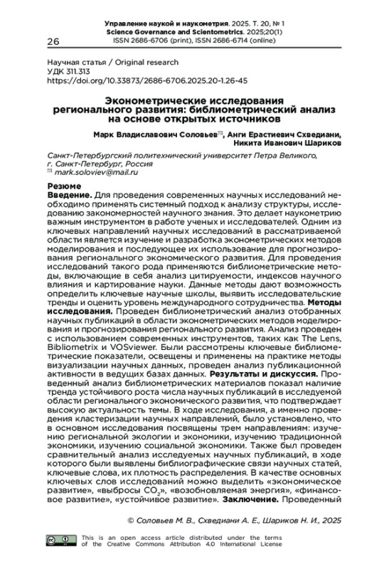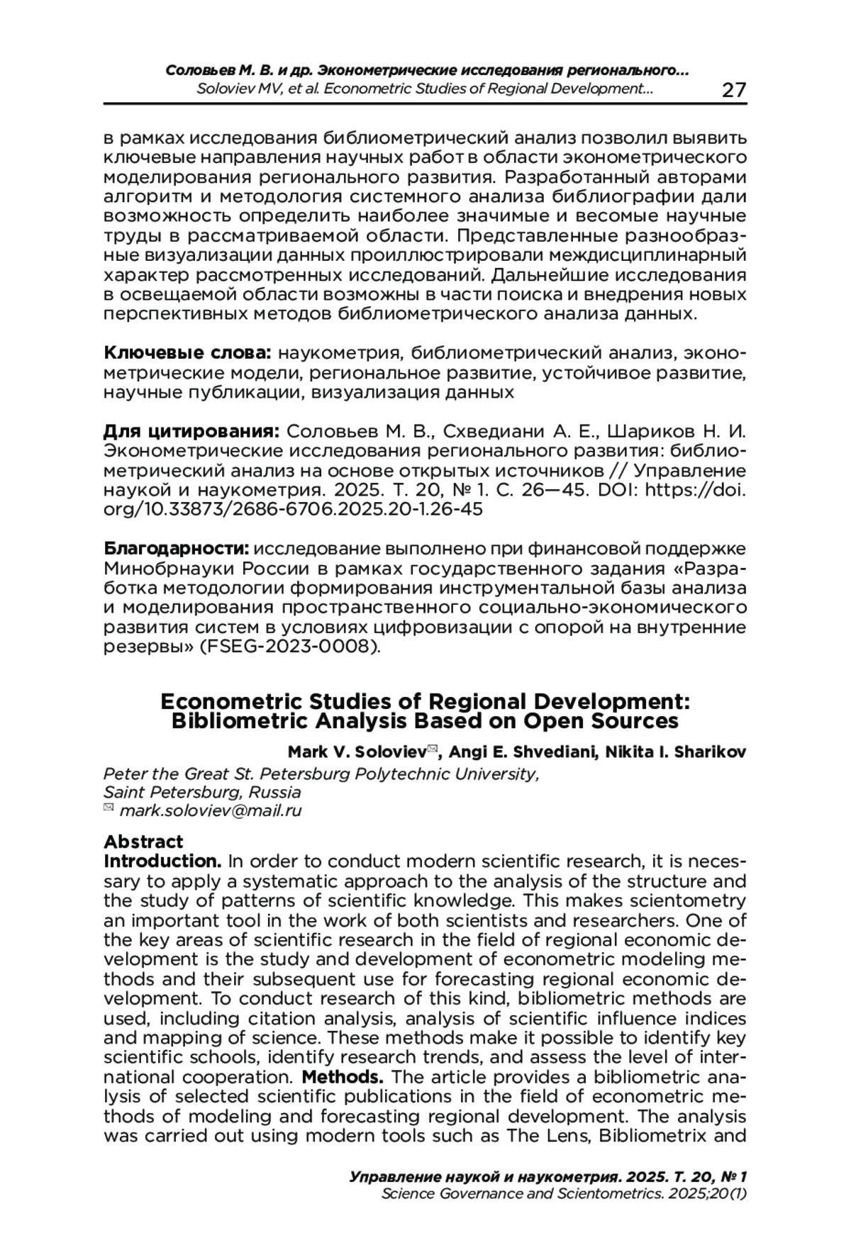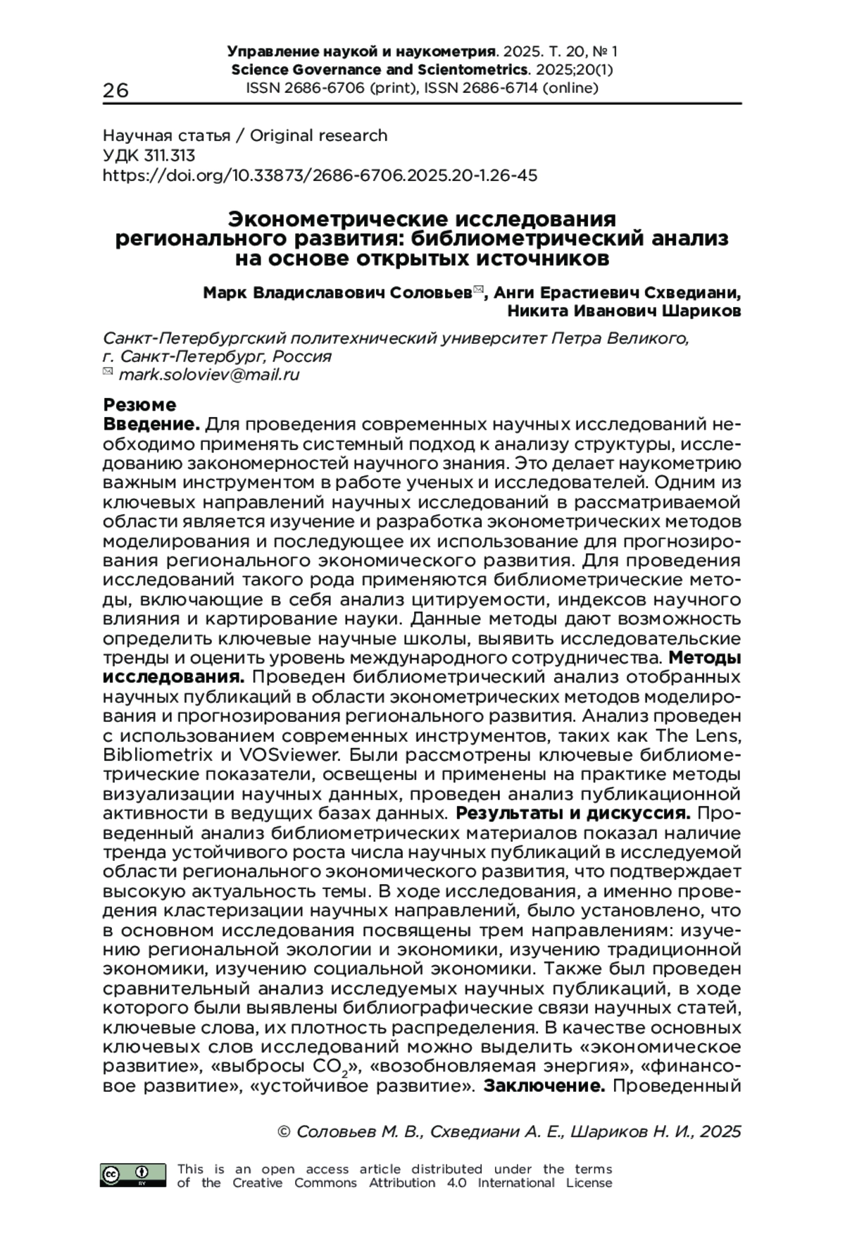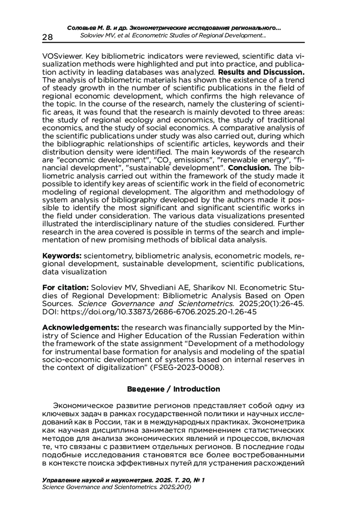 Введение. Для проведения современных научных исследований необходимо применять системный подход к анализу структуры, исследованию закономерностей научного знания. Это делает наукометрию важным инструментом в работе ученых и исследователей. Одним из ключевых направлений научных исследований в рассматриваемой области является изучение и разработка эконометрических методов моделирования и последующее их использование для прогнозирования регионального экономического развития. Для проведения исследований такого рода применяются библиометрические методы, включающие в себя анализ цитируемости, индексов научного влияния и картирование науки. Данные методы дают возможность определить ключевые научные школы, выявить исследовательские тренды и оценить уровень международного сотрудничества.