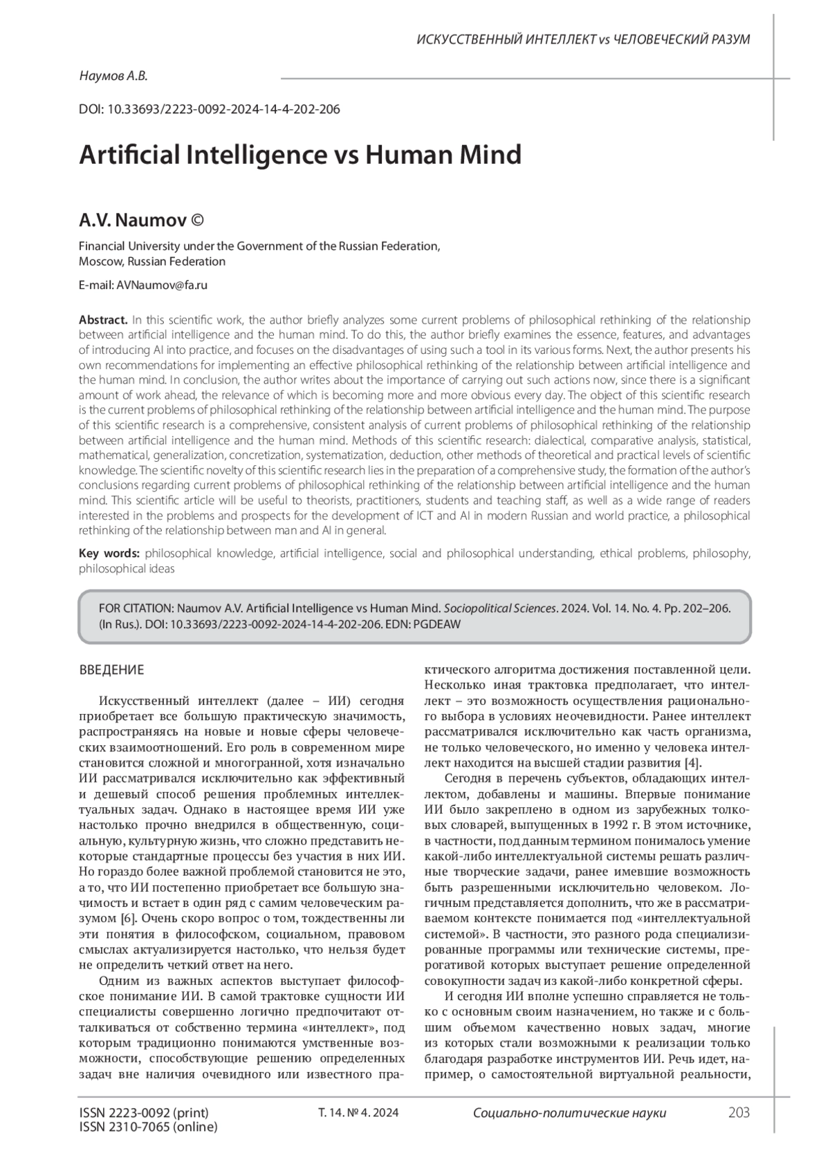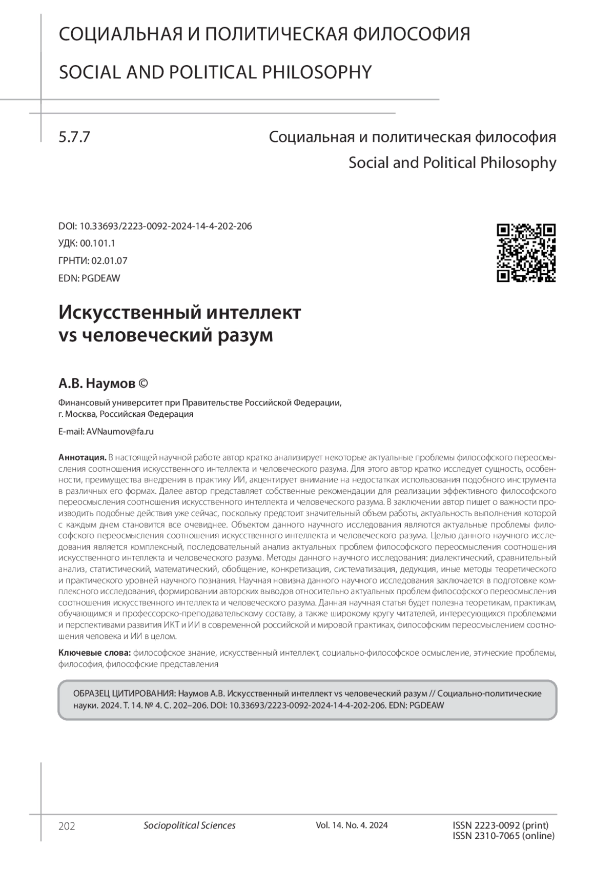 6. Разин А.В. Этика искусственного интеллекта // Философия и общество. 2019. № 15. С. 202-208. EDN: YPCXWS