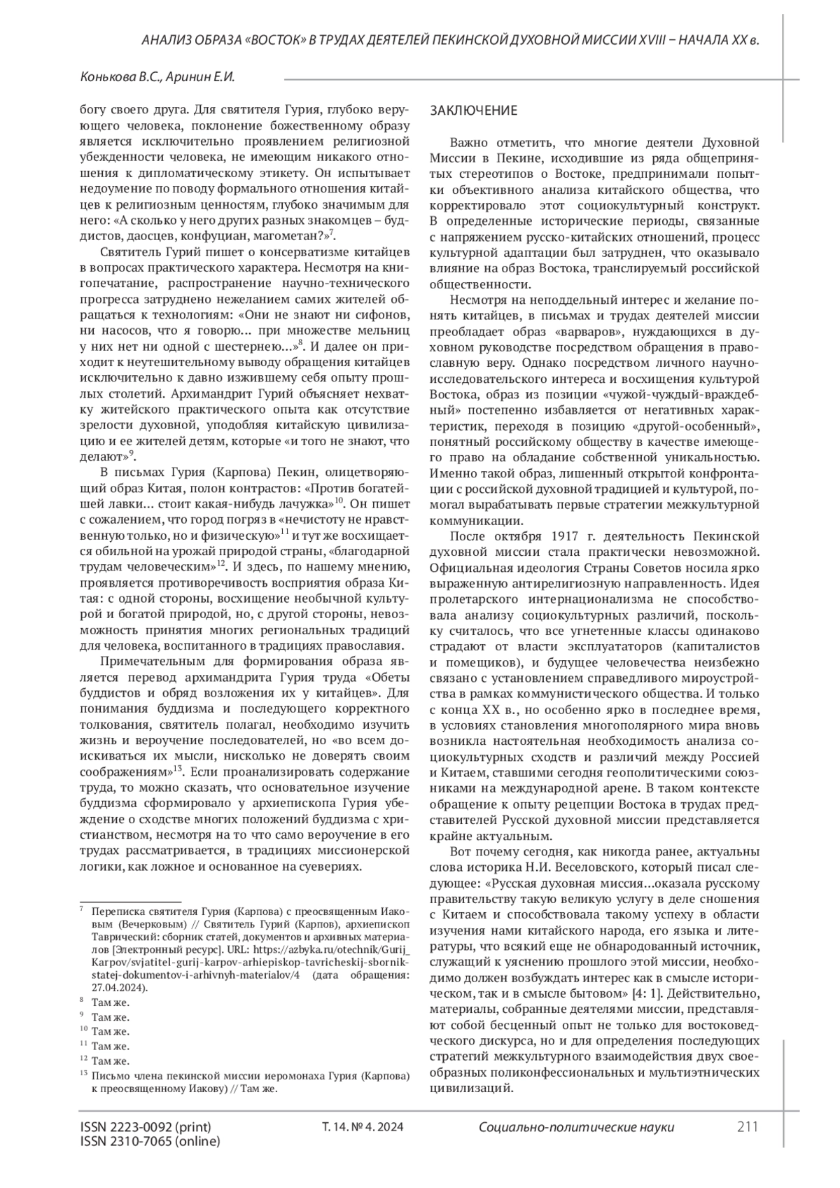 В настоящее время вновь становится актуальным вопрос изучения культурной специфики стран Востока, поскольку развитие сотрудничества между нашей страной и государствами Азии невозможно без понимания особенностей каждой из них. Именно сейчас, в условиях формирования многополярного мира и интенсификации сотрудничества России со странами Aзии (в частности, с Китаем), данная проблема приобретает особую значимость. Поэтому нам следует обратиться к истокам осмысления этой проблематики – опыту деятельности Русской Духовной миссии, которая не ограничивалась только духовной сферой, поскольку в ее основе лежало формирование политических, экономических и социальных связей. Для этого мы обратимся к образу Востока, сформированному в ходе развития русской православной миссии.