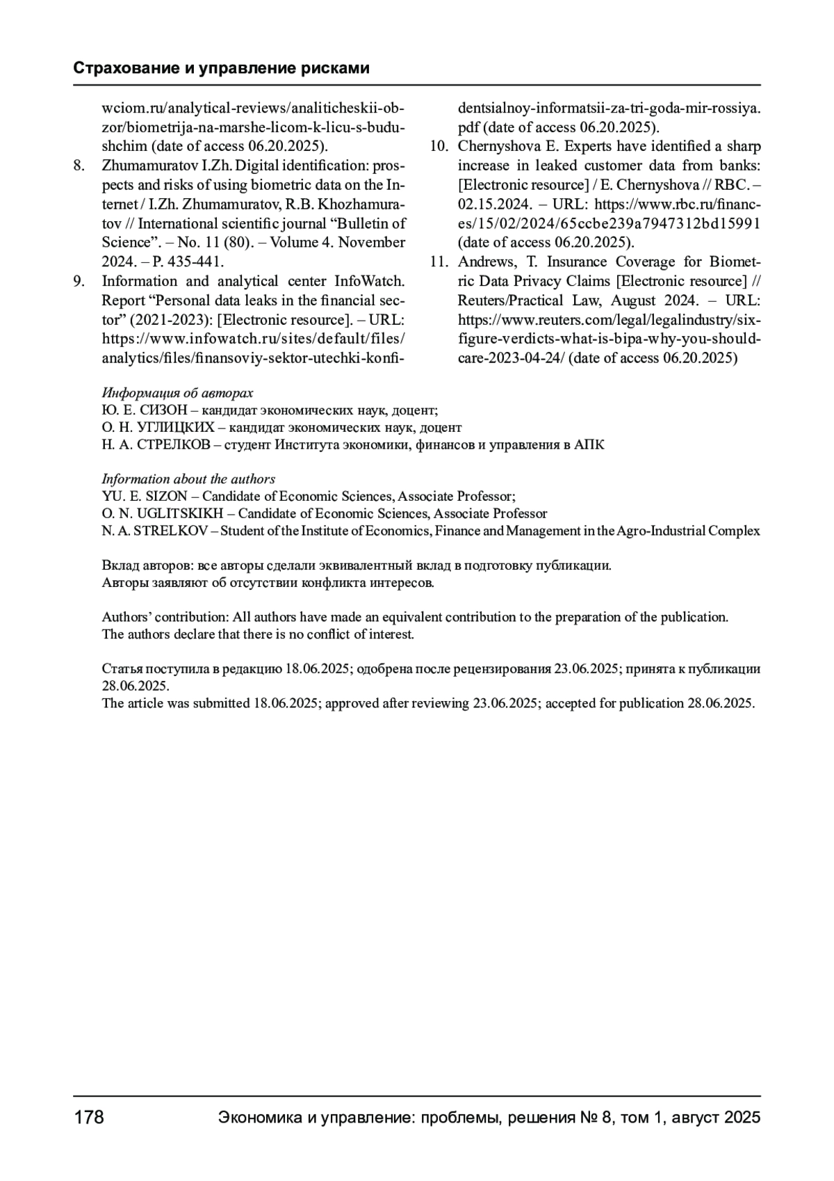 8. Жумамуратов И.Ж. Цифровая идентификация: перспективы и риски использования биометрических данных в интернете / И.Ж. Жумамуратов, Р.Б. Хожамуратов // Международный научный журнал “Вестник науки”. - № 11 (80). - Том 4. ноябрь 2024 г. - С. 435-441. EDN: ZHVXQZ