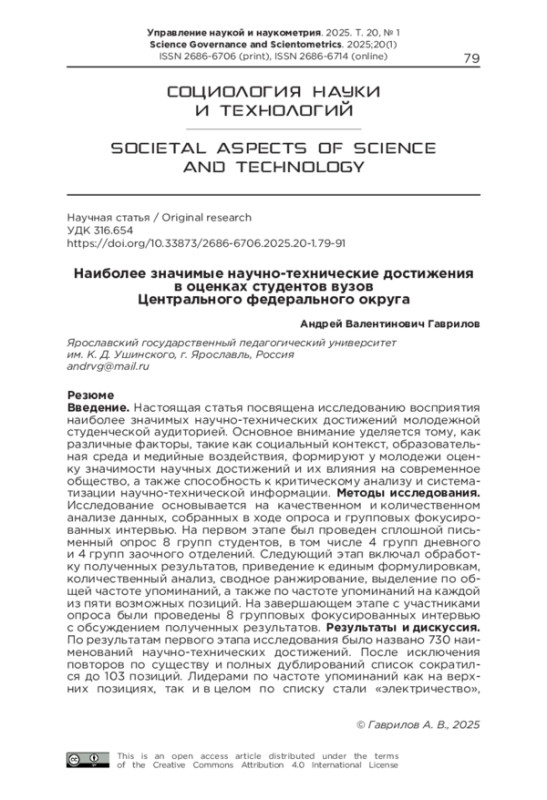 Введение. Настоящая статья посвящена исследованию восприятия наиболее значимых научно-технических достижений молодежной студенческой аудиторией. Основное внимание уделяется тому, как различные факторы, такие как социальный контекст, образовательная среда и медийные воздействия, формируют у молодежи оценку значимости научных достижений и их влияния на современное общество, а также способность к критическому анализу и систематизации научно-технической информации.