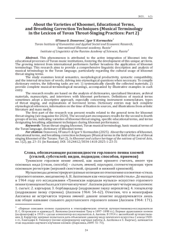 Дефиниция музыкальных терминов иногда подверженадескриптивному подходу, особенно в наименованиях инструментов, видов горлового пения и объяснениях заимствованных терминов. Словарные статьи не всегда содержат полныеэтимологические справки, сведения о времени фиксации висточниках и иллюстрации из художественной литературы исредств массовой информации. В первой части исследования(см. журнал за 2024 год) были представлены результаты по Первой группе терминов, обозначающих общее название горлового пения хоомей. Вовторой части исследования представлены результаты по группам терминов, обозначающих: разновидности горлового пения хоомей; специфические образовательные термины; иприемы корректировки дыхания во время исполнения хоомея.