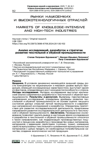 Результаты и дискуссия. Выявлены перспективные направления исследований, определены драйверы развития текстильной и обувной промышленности на основе оценки текущего состояния данных отраслей легкой промышленности и современных направлений исследований и разработок. Определены препятствия для развития исследовательской деятельности, предложены направления развития исследовательской деятельности в текстильной и обувной промышленности.