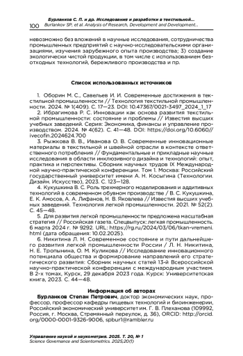 2. Ибрагимова Р. С. Инновации как основа развития текстильной промышленности: состояние и проблемы // Известия высших учебных заведений. Серия: Экономика, финансы и управление производством. 2024. № 4(62). С. 41-48. DOI: 10.6060//ivecofin.2024624.700 EDN: KOLATK