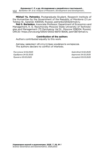 Заключение. Проведенное исследование позволяет сделать вывод: в настоящее время исследования и разработки в текстильной и обувной промышленности относятся к таким направлениям, как модернизация производственных мощностей и процессов; разработка и производство новых материалов, материалов с заданными свойствами («умные» ткани), изменение свойств выпускаемых текстильной и кожевенной промышленностью материалов с целью придать им необходимые потребительские качества; создание экологически чистой продукции.