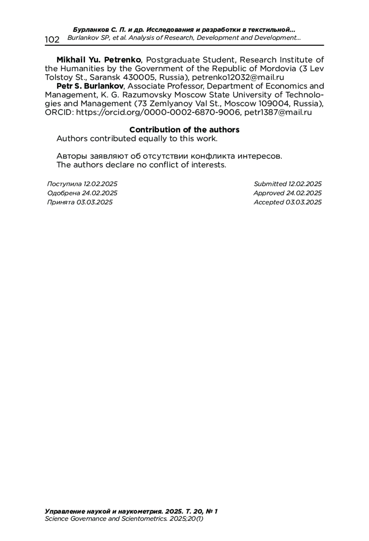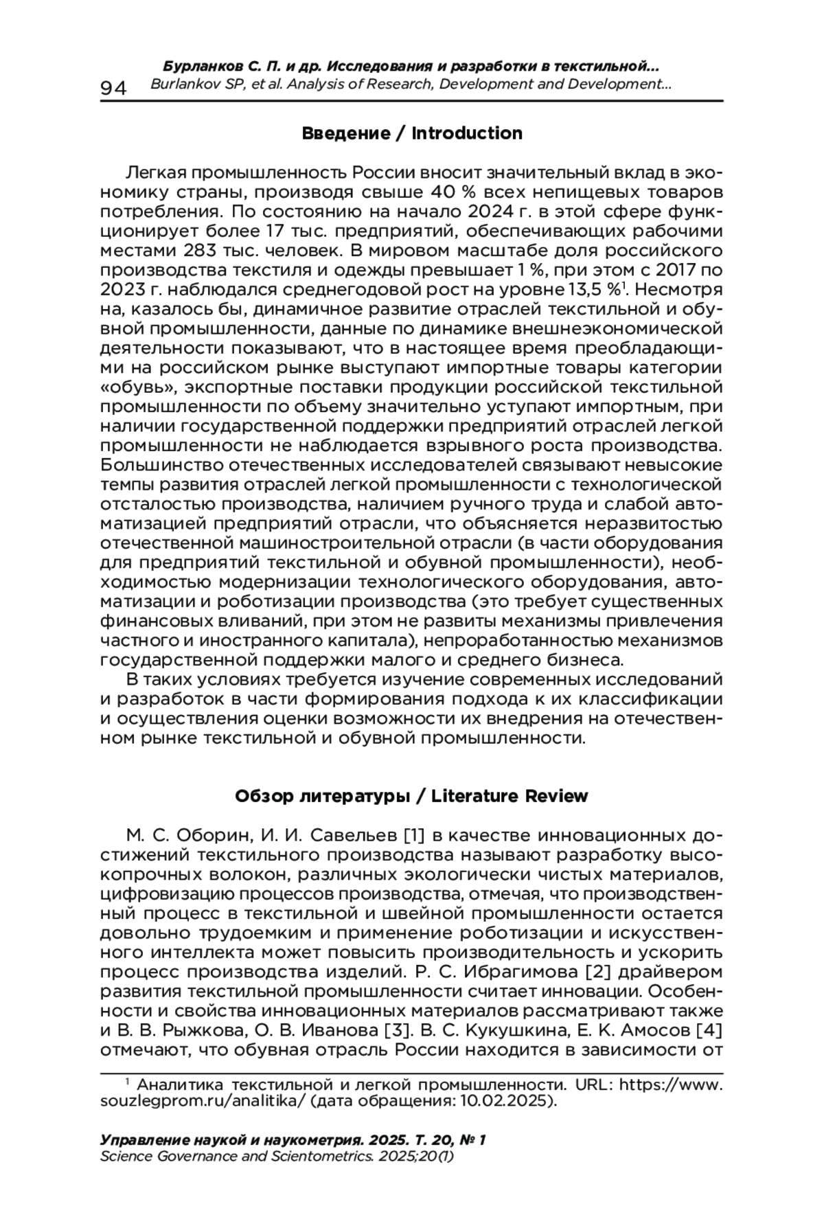 1. Оборин М. С., Савельев И. И. Современные достижения в текстильной промышленности // Технология текстильной промышленности. 2024. № 1(409). С. 17-23. DOI: 10.47367/0021-3497_2024_1_17