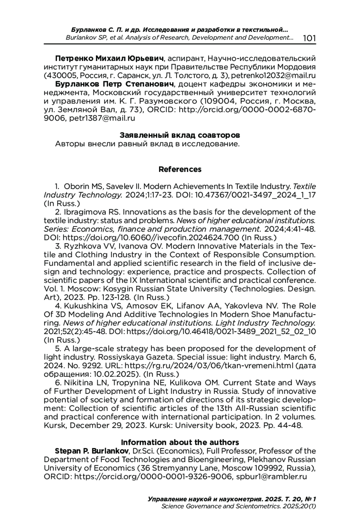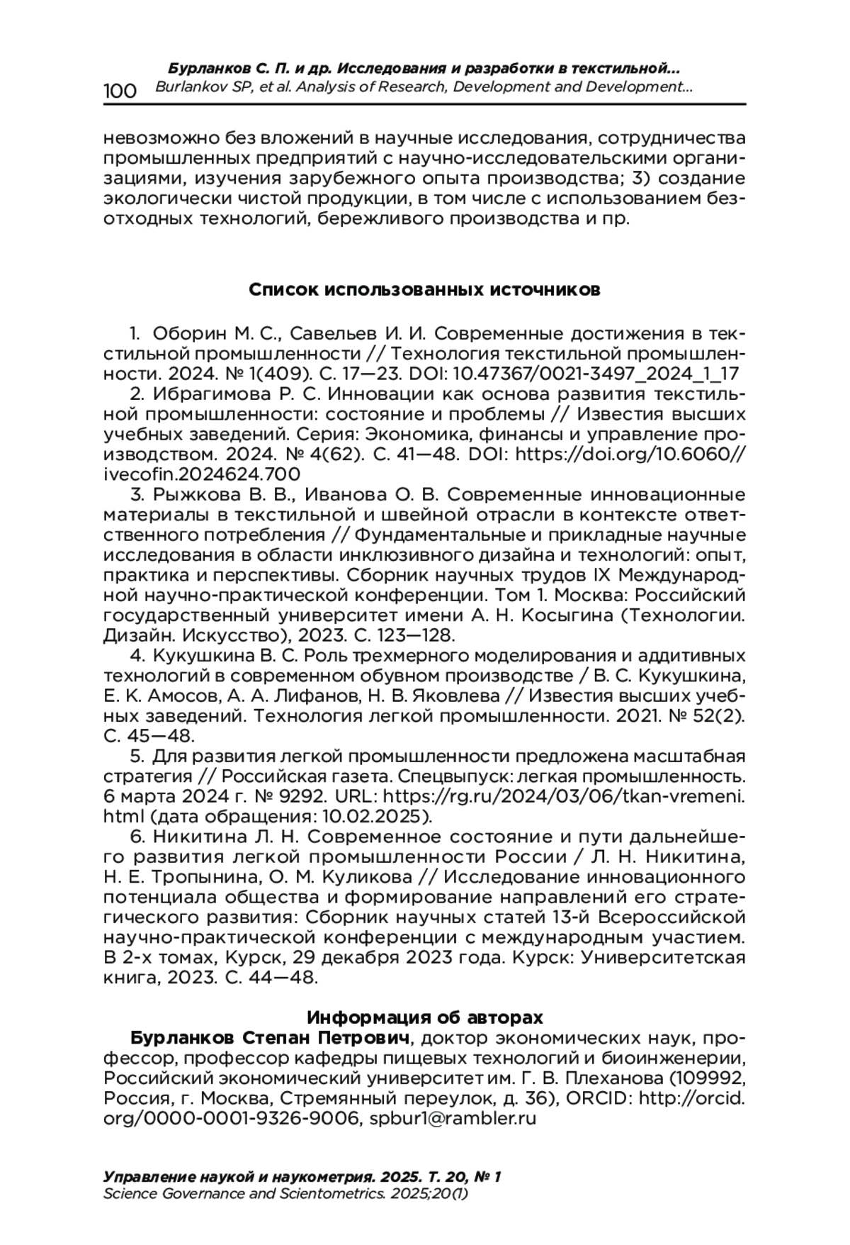6. Никитина Л. Н. Современное состояние и пути дальнейшего развития легкой промышленности России / Л. Н. Никитина, Н. Е. Тропынина, О. М. Куликова // Исследование инновационного потенциала общества и формирование направлений его стратегического развития: Сборник научных статей 13-й Всероссийской научно-практической конференции с международным участием. В 2-х томах, Курск, 29 декабря 2023 года. Курск: Университетская книга, 2023. С. 44-48. EDN: AURDSN