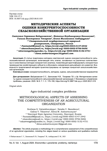 В статье предложена методика комплексной оценки конкурентоспособности сельскохозяйственной организации, включающая пять этапов, основанных на различных количественных и качественных методах конкурентного анализа, позволяющая идентифицировать конкурентные преимущества хозяйствующего субъекта и обосновать направления дальнейшего его развития. Возможности предлагаемой методики проиллюстрированы на примере конкретной сельскохозяйственной организации.