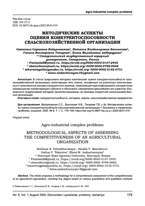3. Загрутдинов А.Р. Методические подходы исследования конкурентоспособности сельскохозяйственных организаций // Конкурентоспособность в глобальном мире: экономика, наука, технологии. 2024. № 2. С. 114-119. EDN: AEZOYP