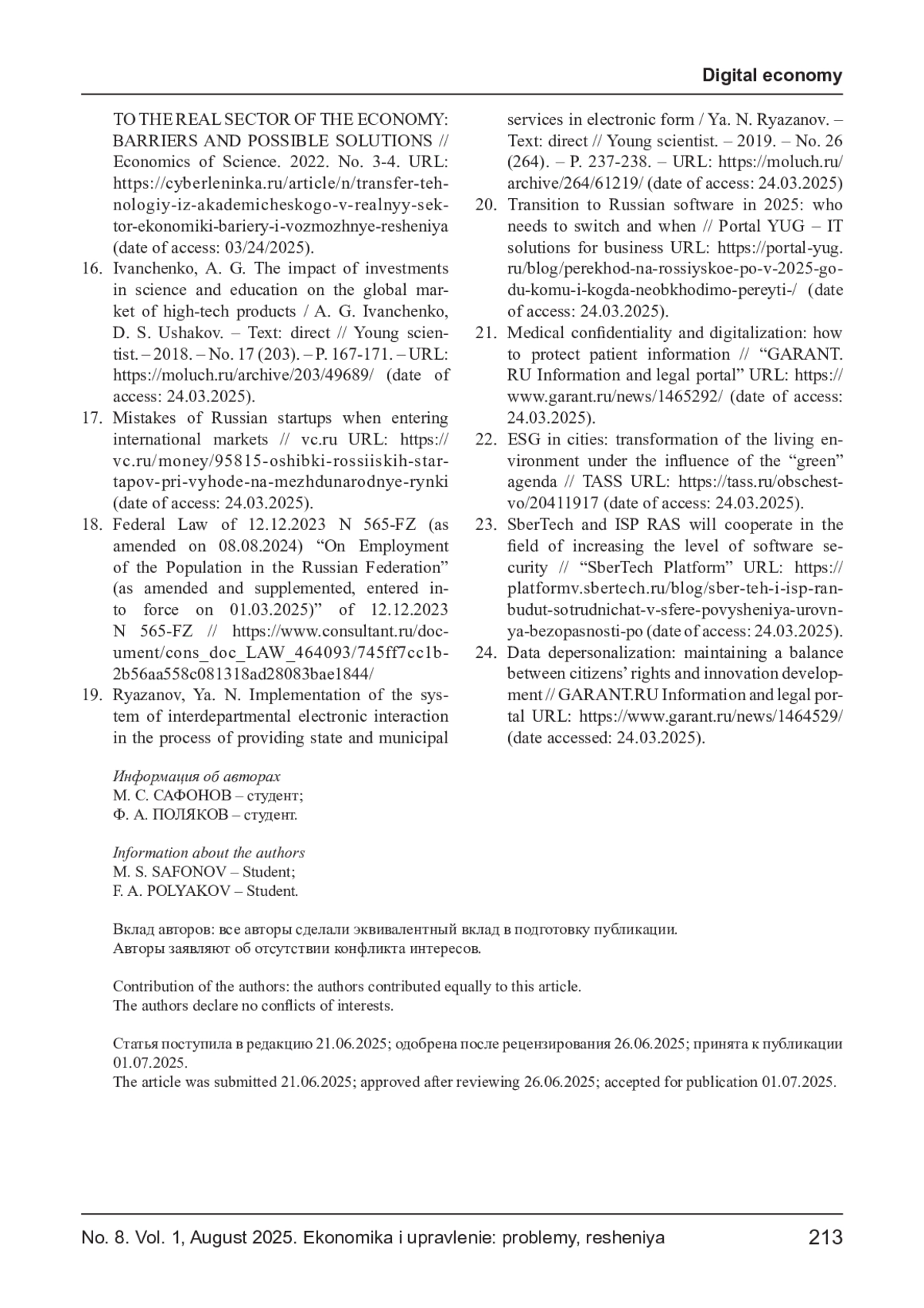 19. Рязанов, Я. Н. Реализация системы межведомственного электронного взаимодействия в процессе предоставления государственных и муниципальных услуг в электронной форме / Я. Н. Рязанов. - Текст: непосредственный // Молодой ученый. - 2019. - № 26 (264). - С. 237238. - URL: https://moluch.ru/archive/264/61219/(дата обращения: 24.03.2025). EDN: OFVECY