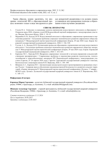 2. Муравейко К.В., Белодед Н.И. Искусственный интеллект в образовании: современные применения и перспективы развития // Актуальные проблемы социально-экономического развития современного общества: материалы V Международной научно-практической конференции (Киров, 29 мая 2024 года). Киров: Кировский государственный медицинский университет, 2024. С. 526-529.