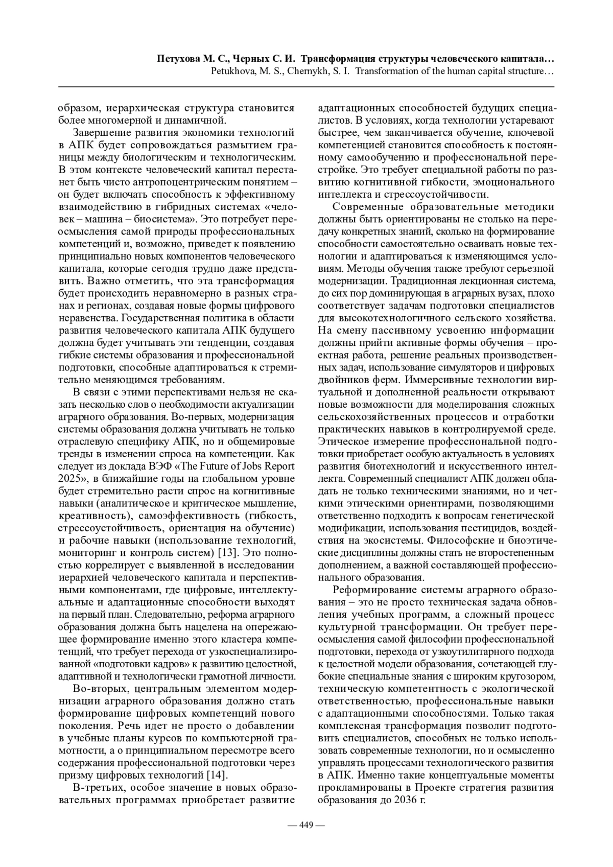 Современный этап, соответствующий шестому технологическому укладу (с 2010-х гг.), характеризуется окончательным становлением экономики технологий в АПК. Искусственный интеллект, интернет вещей, технологии точного земледелия, геномное редактирование – все это превращает цифровой капитал в ключевой компонент человеческого капитала.