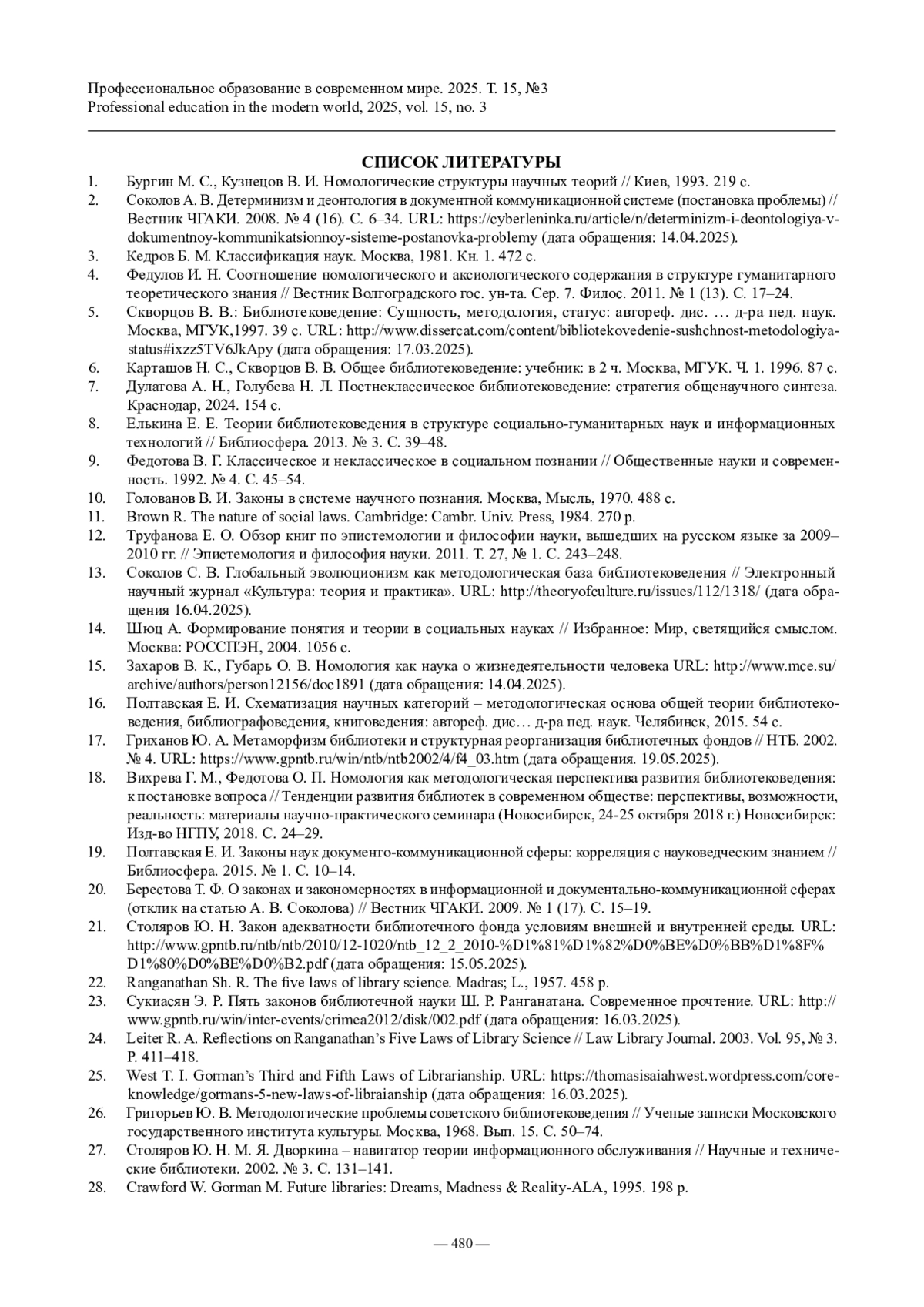 19. Полтавская Е. И. Законы наук документо-коммуникационной сферы: корреляция с науковедческим знанием // Библиосфера. 2015. № 1. С. 10-14.