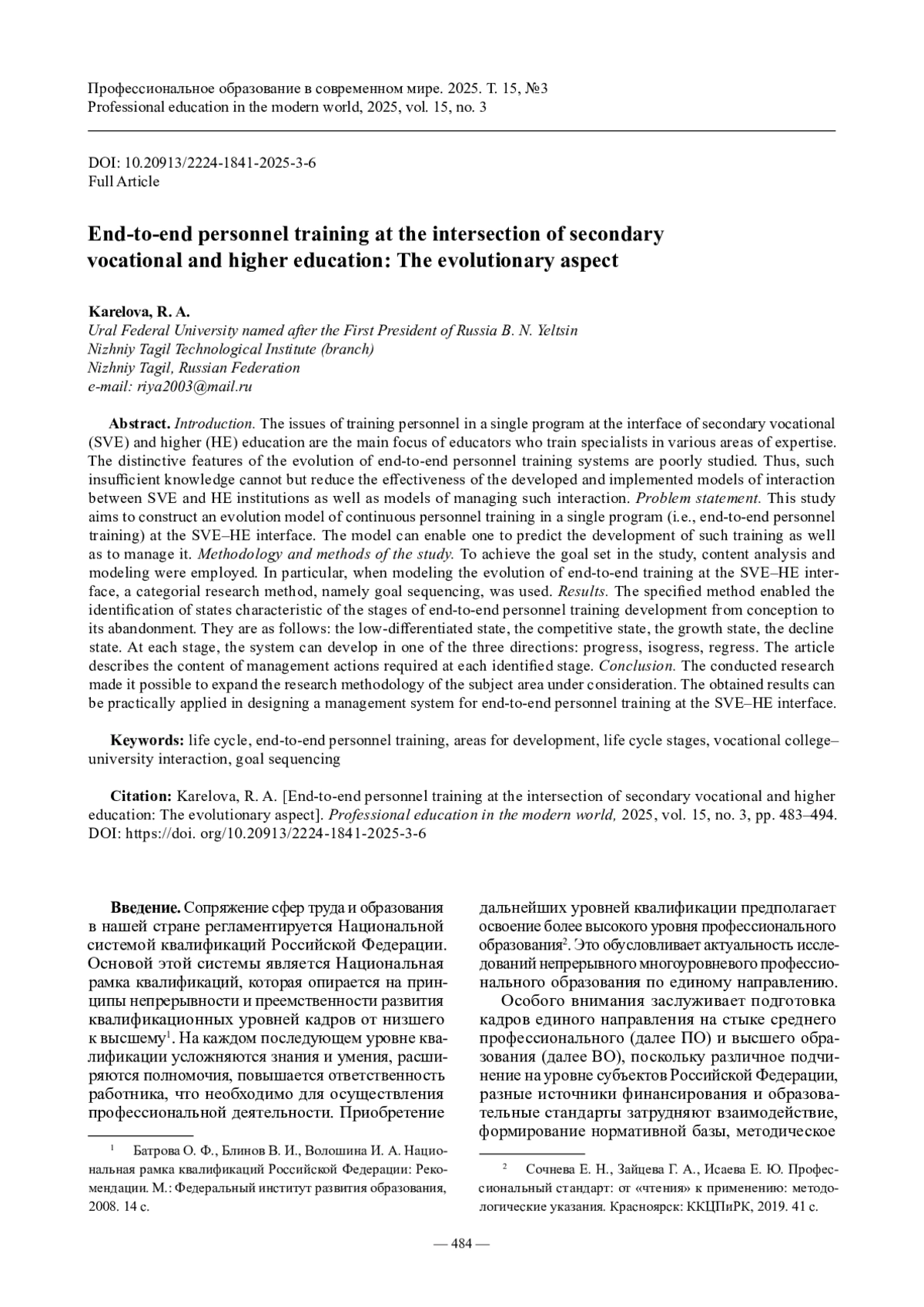 Введение. Вопросы подготовки кадров по единому направлению на стыке СПО – ВО находятся в фокусе внимания педагогов, подготавливающих специалистов разных профилей. Слабая изученность особенностей эволюции систем непрерывной подготовки кадров не может не снижать эффективность разрабатываемых и воплощаемых в жизнь моделей взаимодействия учреждений среднего профессионального образования и высшего образования и моделей управления таким взаимодействием.
