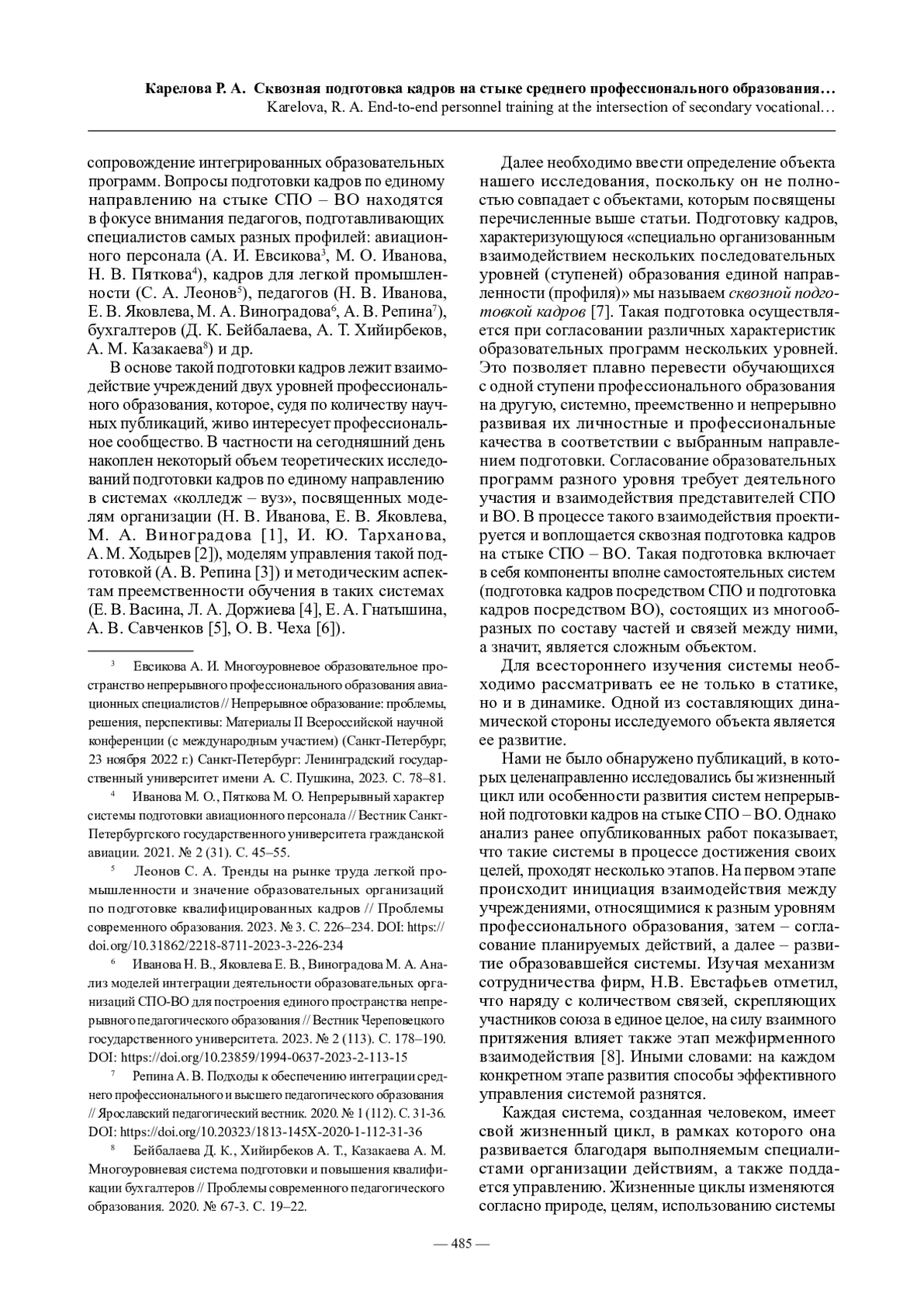 1. Иванова Н. В., Яковлева Е. В., Виноградова М. А. Анализ моделей интеграции деятельности образовательных организаций СПО-ВО для построения единого пространства непрерывного педагогического образования // Вестник Череповецкого государственного университета. 2023. № 2 (113). С. 178-190. https://doi.org/https://doi.org/10.23859/1994-0637-2023-2-113-15