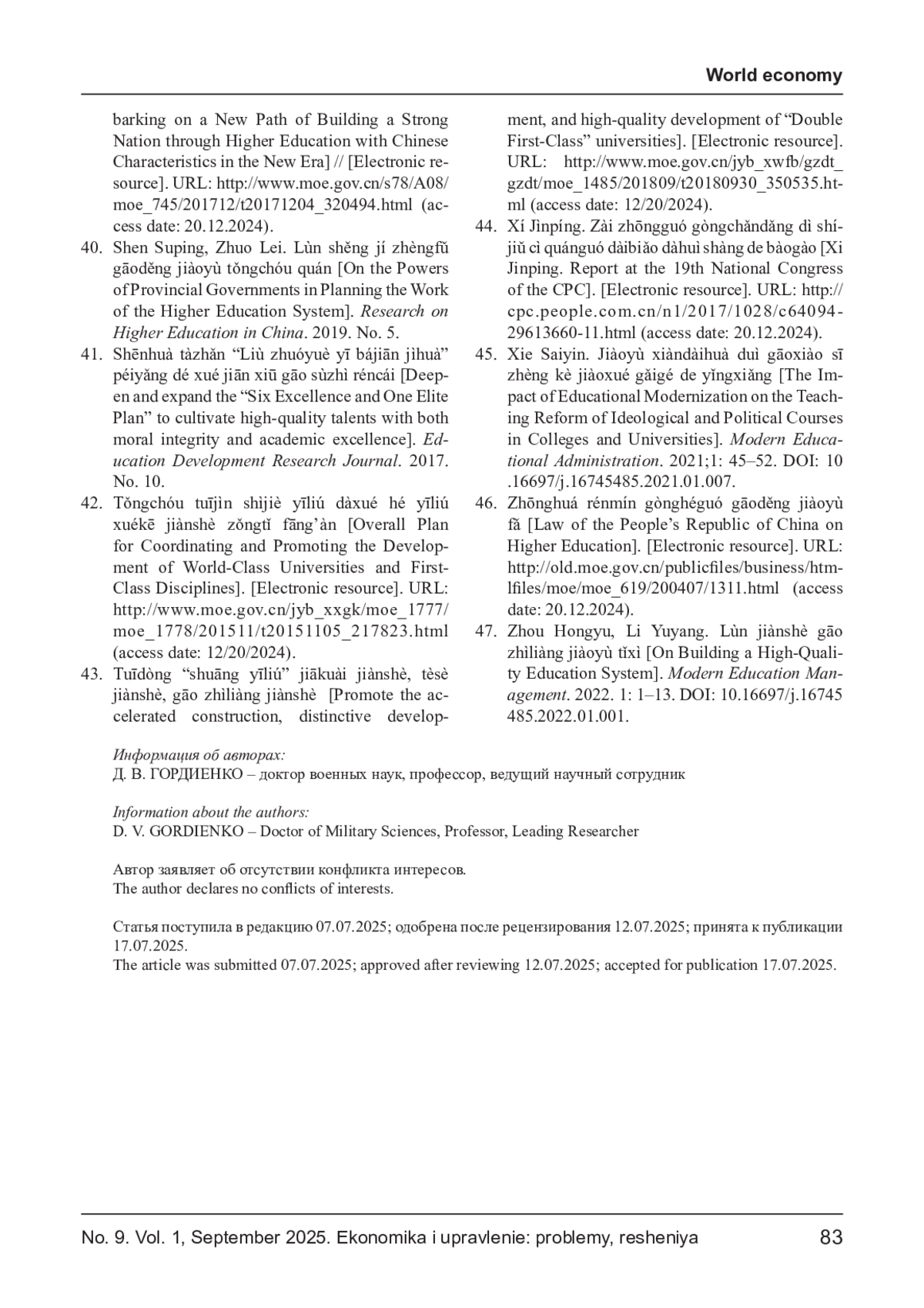 18. Пироженко Л. В., Ван Синсинь Высшее образование в Китае: современное состояние и основные направления развития до 2035 г. [Электронный ресурс]. URL: https://elib.bsu.by/bitstream/123456789/285487/1/43-49.pdf (дата обращения: 20.03.2025).