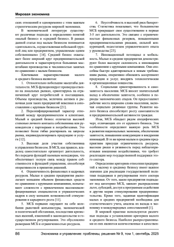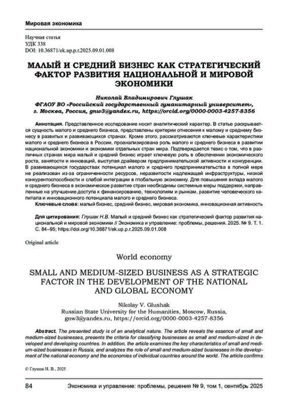 Представленное исследование носит аналитический характер. В статье раскрывается сущность малого и среднего бизнеса, представлены критерии отнесения к малому и среднему бизнесу в развитых и развивающихся странах. Кроме этого, рассматриваются ключевые характеристики малого и среднего бизнеса в России, проанализирована роль малого и среднего бизнеса в развитии национальной экономики и экономики отдельных стран мира. Подтверждается тезис о том, что в различных странах мира малый и средний бизнес играет ключевую роль в обеспечении экономического роста, занятости и инноваций, выступая драйвером предпринимательской активности и конкуренции. В развивающихся государствах потенциал малого и среднего предпринимательства в полной мере не реализован из-за ограниченности ресурсов, неразвитости надлежащей инфраструктуры, низкой конкурентоспособности и слабой интеграции в глобальную экономику. Для повышения вклада малого и среднего бизнеса в экономическое развитие стран необходимы системные меры поддержки, направленные на улучшение доступа к финансированию, технологиям и рынкам, развитие человеческого капитала и инновационного потенциала малого и среднего бизнеса.