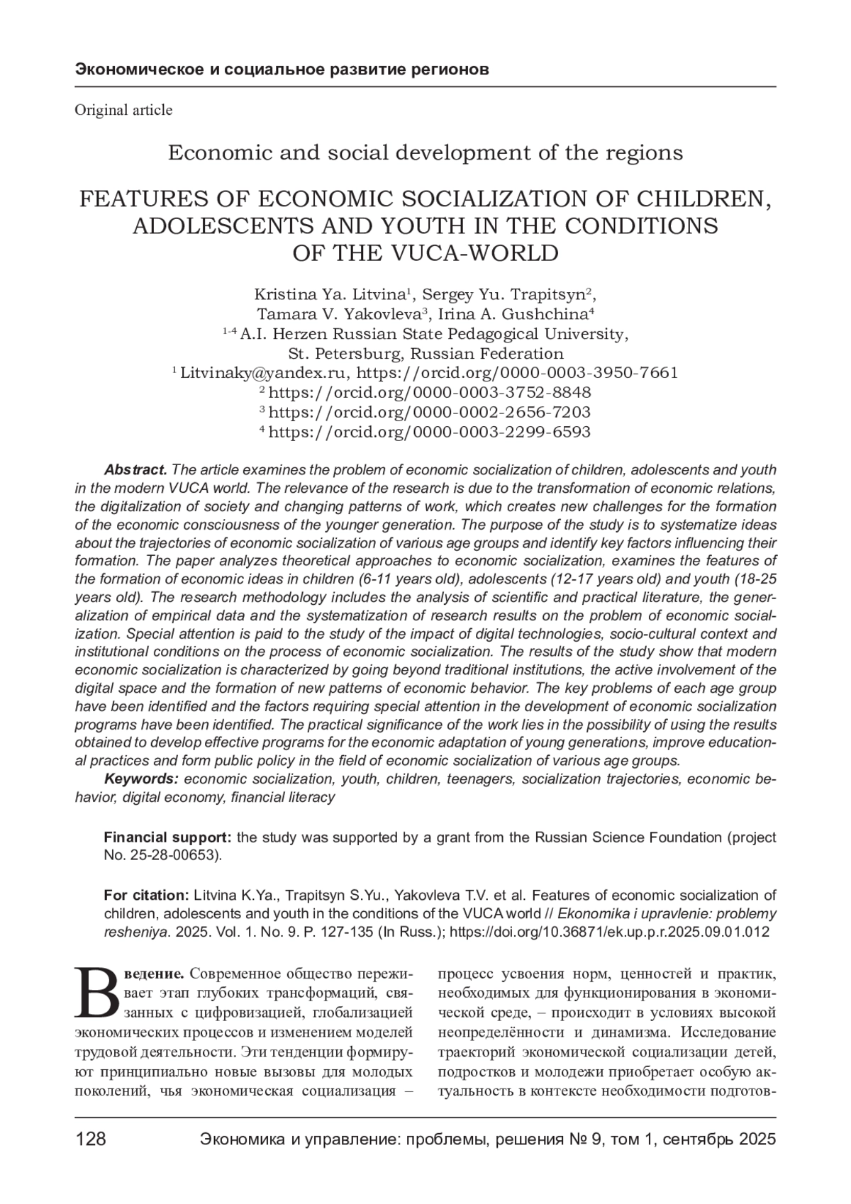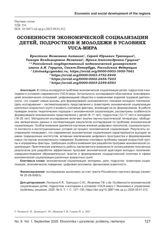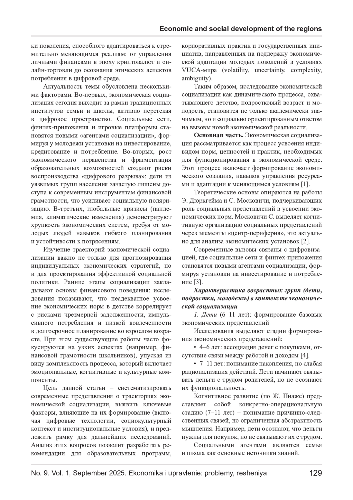 В статье исследуется проблема экономической социализации детей, подростков и молодежи в условиях современного VUCA-мира. Актуальность исследования обусловлена трансформацией экономических отношений, цифровизацией общества и изменением моделей трудовой деятельности, что создает новые вызовы для формирования экономического сознания молодого поколения. Цель исследования - систематизировать представления о траекториях экономической социализации различных возрастных групп и выявить ключевые факторы, влияющие на их формирование. В работе проведен анализ теоретических подходов к экономической социализации, рассмотрены особенности формирования экономических представлений у детей (6-11 лет), подростков (12-17 лет) и молодежи (18-25 лет). Методология исследования включает анализ научно-практической литературы, обобщение эмпирических данных и систематизацию результатов исследований по проблеме экономической социализации. Особое внимание уделяется изучению влияния цифровых технологий, социокультурного контекста и институциональных условий на процесс экономической социализации. Результаты исследования показывают, что современная экономическая социализация характеризуется выходом за рамки традиционных институтов, активным вовлечением цифрового пространства и формированием новых паттернов экономического поведения. Выявлены ключевые проблемы каждой возрастной группы и определены факторы, требующие особого внимания при разработке программ экономической социализации. Практическая значимость работы заключается в возможности использования полученных результатов для разработки эффективных программ экономической адаптации молодых поколений, совершенствования образовательных практик и формирования государственной политики в сфере экономической социализации различных возрастных групп.