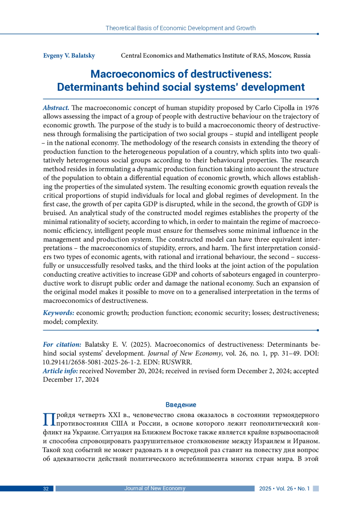 Макроэкономическая концепция человеческой глупости, предложенная Карло Чиполлой в 1976 г., позволяет рассматривать влияние группы лиц с деструктивным поведением на траекторию экономического роста. Статья посвящена построению макроэкономической теории деструктивности на основе формализации участия двух социальных групп – «глупцов» и «умников» – в национальной экономике. Методология исследования состоит в распространении теории производственных функций на гетерогенное население страны, которое распадается на две качественно неоднородные по своим поведенческим свойствам социальные группы. Метод включал динамизацию производственной функции с учетом структуры населения для получения дифференциального уравнения экономического роста, которое позволяет определить свойства моделируемой системы. Полученное уравнение установило критические доли группы «глупцов» для локального и глобального режимов развития. В первом случае нарушается рост душевого ВВП, а во втором – рост объема ВВП. Аналитическое исследование режимов построенной модели выявило свойство минимальной разумности общества, согласно которому для поддержания режима макроэкономической эффективности умные люди должны обеспечить себе минимальное влияние в системе управления и производства. Построенная модель может иметь три эквивалентные трактовки – макроэкономики глупости, ошибок и вреда. В первом случае рассматриваются два типа экономических агентов с рациональным и иррациональным поведением, во втором – успешно или неудачно решаемые задачи, в третьем – совместное действие населения, ведущее созидательную деятельность по увеличению ВВП, и когорты «диверсантов», занятых контрпродуктивной работой по нарушению общественного порядка и нанесению национальной экономике ущерба. Расширение интерпретаций исходной модели позволяет перейти к обобщенной трактовке в терминах макроэкономики деструктивности