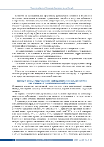 Исследование теоретических основ региональной политики приобретает особую актуальность в контексте современных глобальных вызовов, трансформирующих пространственную организацию экономики и общества. К их числу относятся глобализация и регионализация, экологические угрозы, демографические и технологические трансформации, усиление пространственной поляризации и периферийности. Для Российской Федерации, испытывающей специфические риски регионального развития (дезинтеграция, дивергенция, демографическое сжатие), а также для многих крупных стран мира, эти вызовы обусловливают критическую важность выработки новых эффективных механизмов и инструментов устойчивого социально-экономического развития регионов, адекватных новым геополитическим и геоэкономическим условиям функционирования.