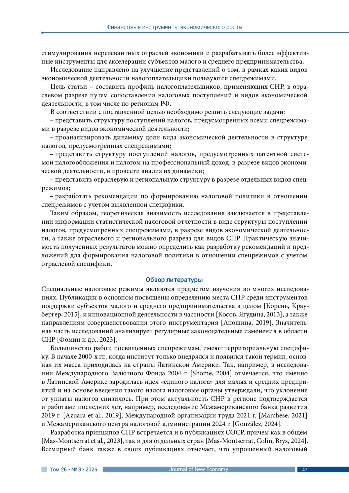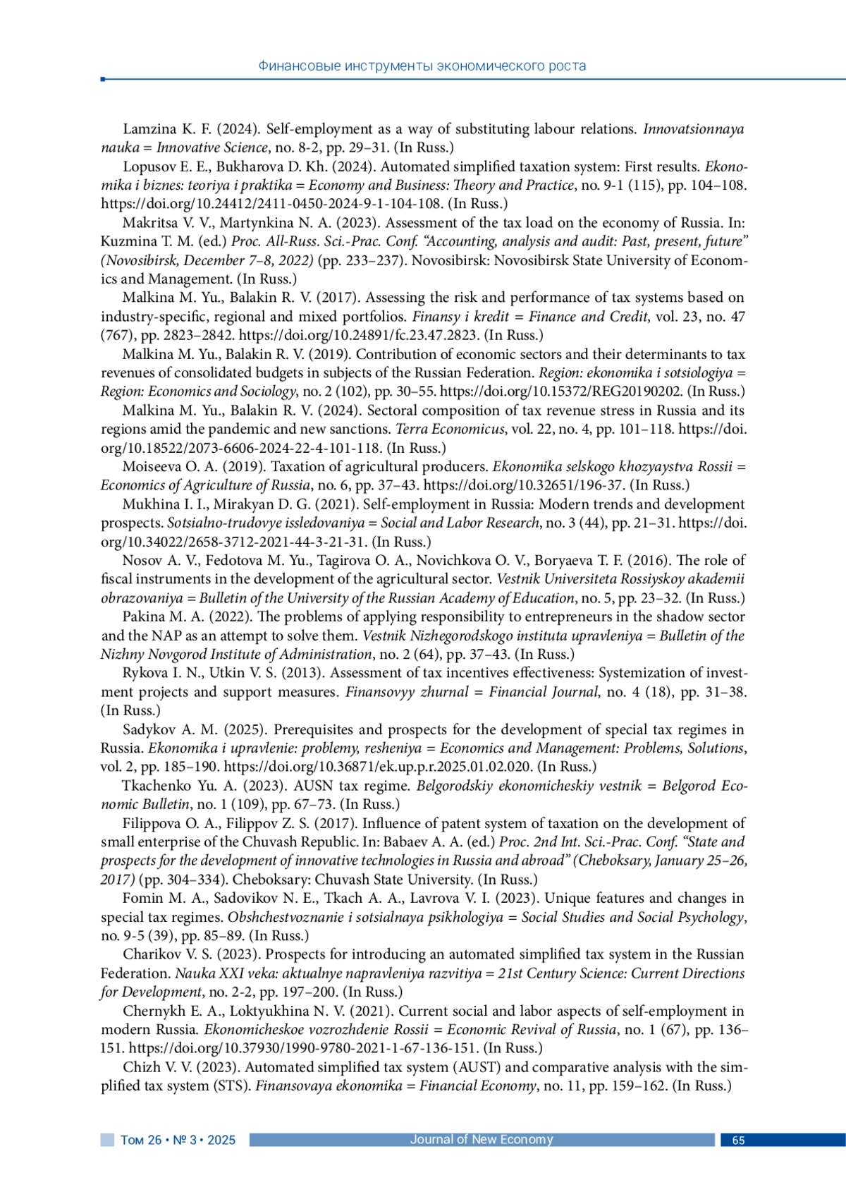 25. Садыков А. М. (2025). Переосмысление специальных налоговых режимов в цифровой экономике: от вмененного дохода к фактическим результатам деятельности // Экономика и управление: проблемы, решения. Т. 2. С. 185-190. DOI: 10.36871/ek.up.p.r.2025.01.02.020 EDN: BFTVTG
