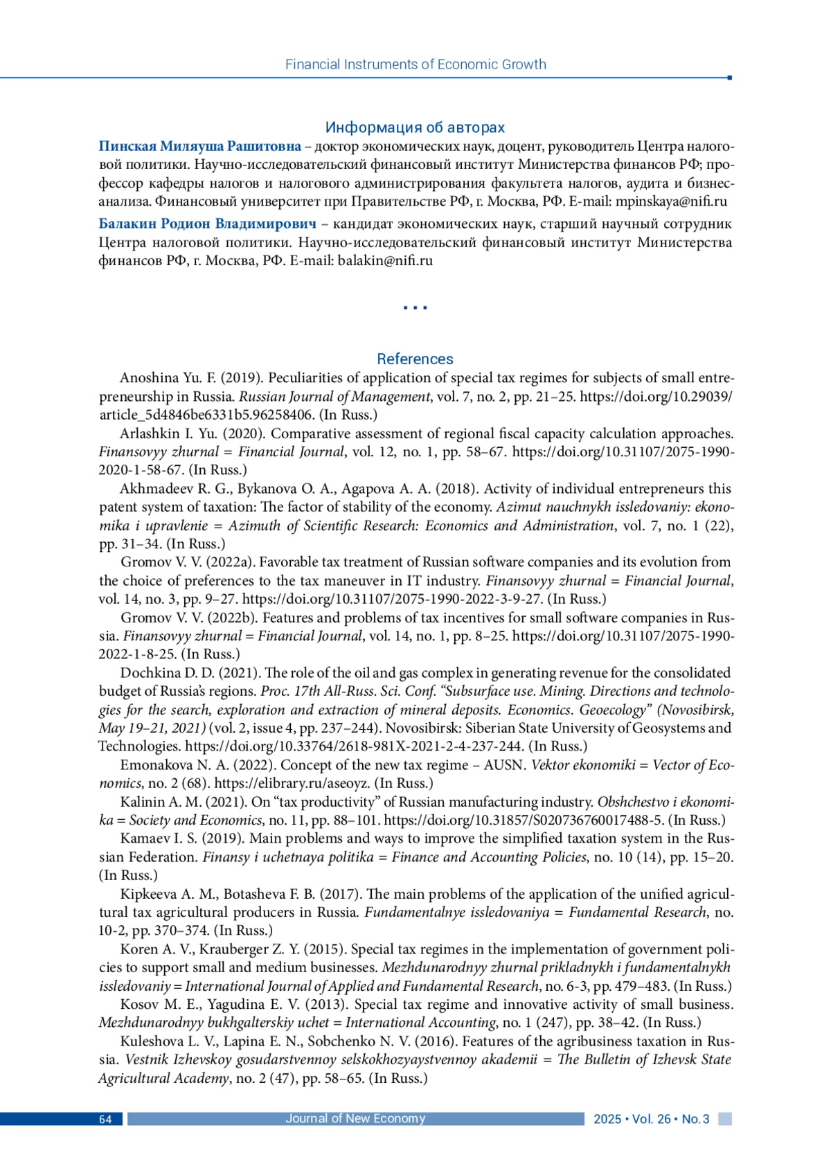 1. Аношина Ю. Ф. (2019). Особенности применения специальных налоговых режимов для субъектов малого предпринимательства в России // Russian Journal of Management. Т. 7, № 2. С. 21-25. DOI: 10.29039/article_5d4846be6331b5.96258406 EDN: NPRUNI