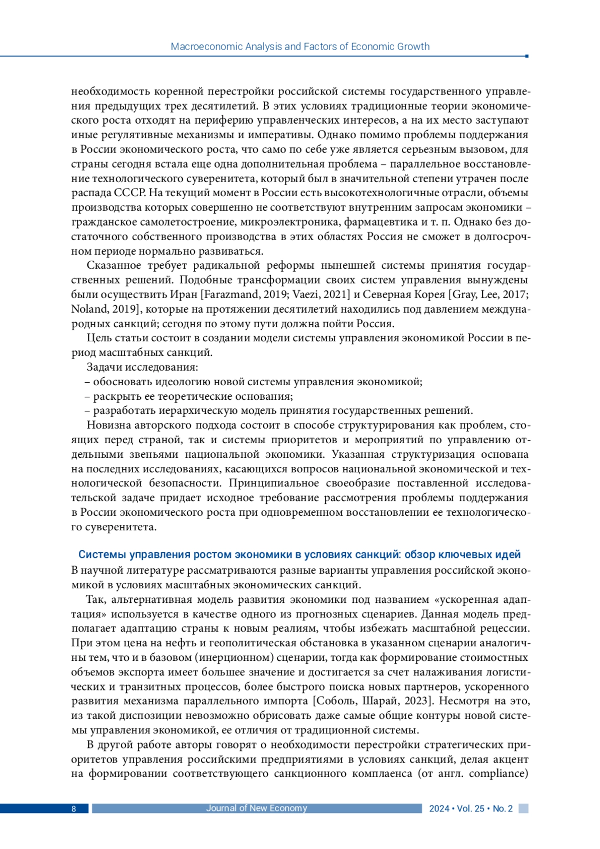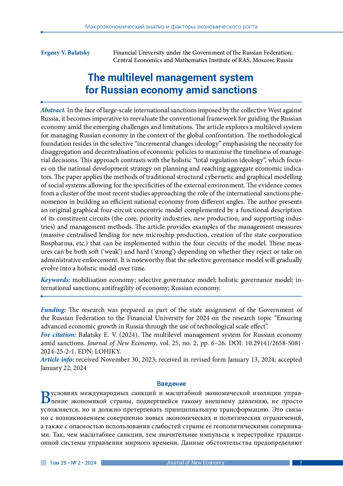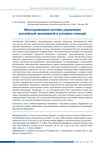 Масштабные международные санкции, введенные объединенным Западом против России, предполагают пересмотр традиционной системы управления российской экономикой с учетом возникающих вызовов и ограничений. Статья посвящена рассмотрению многоуровневой системы управления экономикой России, релевантной для условий международной конфронтации. Методологической основой исследования является селективная «идеология пошаговых изменений», предполагающая дезагрегирование и децентрализацию экономической политики с целью обеспечения максимальной оперативности управленческих решений, в противовес холистической «идеологии тотального регулирования», ориентированной на планирование и выполнение обобщенных экономических индикаторов в рамках национальной стратегии развития. Использовались методы традиционного структурно-кибернетического и графического моделирования социальных систем с учетом специфики внешней среды. Информационной базой выступает кластер новейших исследований, раскрывающих с разных сторон роль феномена международных санкций в построении эффективной национальной экономики. Автором предложена графическая 4-контурная модель концентрического типа, которая дополняется функциональным описанием входящих в нее контуров (ядро экономики, приоритетные отрасли, новые производства и поддерживающие сектора) и методов управления. Приведены примеры управленческих мероприятий (массированное централизованное кредитование новых производств микрочипов, создание государственной корпорации «Росфарма» и т. д.), которыми могут быть наполнены четыре контура предлагаемой модели. Указанный набор мероприятий включает мягкие (слабые) меры, отрицающие административный форсинг, и жесткие (сильные) меры, которые его подразумевают. Показано, что в долгосрочной перспективе селективная модель управления будет постепенно преобразовываться в холистическую модель.