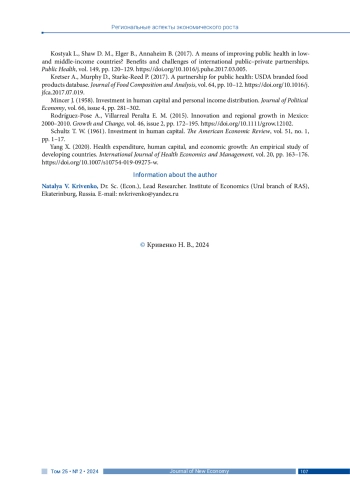 31. Yang X. (2020). Health expenditure, human capital, and economic growth: An empirical study of developing countries. International Journal of Health Economics and Management, vol. 20, pp. 163-176. DOI: 10.1007/s10754-019-09275-w EDN: SFWZUE