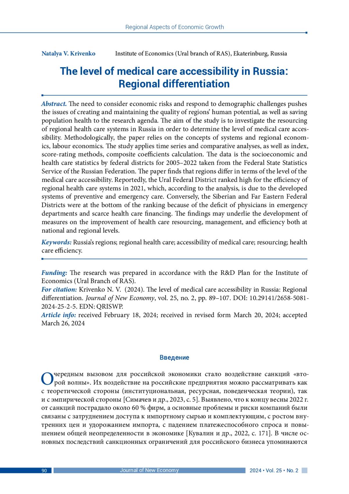 Необходимость учета экономических рисков и решения демографических проблем ставит на повестку вопросы формирования и сохранения качественного человеческого потенциала регионов, здоровьесбережения населения страны. Статья посвящена исследованию ресурсного обеспечения региональных систем здравоохранения в РФ для определения уровня доступности медицинской помощи населению. Методологической основой послужили концепции системной и региональной экономики, экономики труда. Использовались методы динамического, компаративного анализа, индексный, балльно-рейтинговый метод, метод интегральных коэффициентов. Информационную базу исследования составили данные Росстата по социально-экономическим показателям и по показателям здравоохранения федеральных округов России за 2005–2022 гг. Выявлена региональная дифференциация уровня доступности медицинской помощи населению. Так, например, высокие позиции Уральского федерального округа в 2021 г. в рейтинге эффективности региональных систем здравоохранения обусловлены развитой системой профилактики и оказания неотложной медицинской помощи населению. В то же время Сибирский и Дальневосточный федеральные округа находились в конце этого рейтинга из-за низкого уровня обеспеченности врачами отделений скорой медицинской помощи и финансирования здравоохранения. Результаты исследования могут быть использованы при разработке мер по улучшению ресурсного обеспечения, совершенствованию управления и повышению эффективности здравоохранения на уровне страны и ее регионов