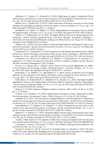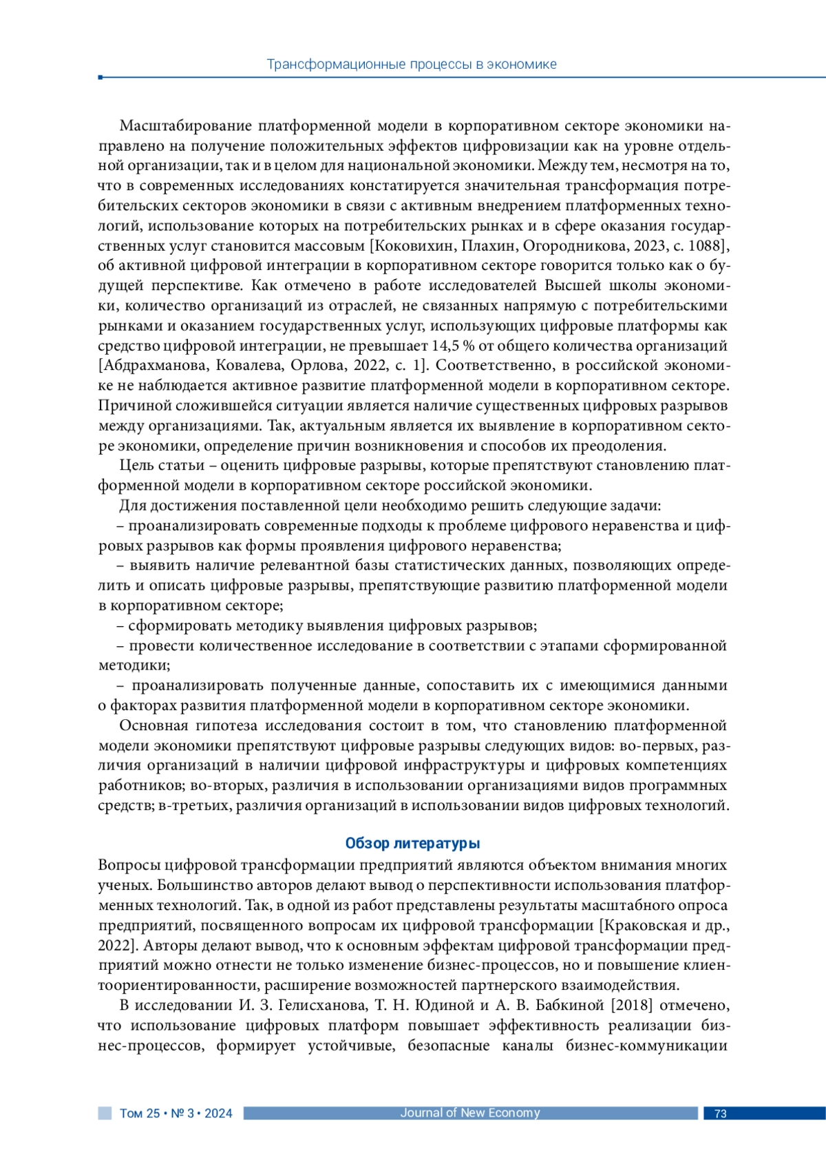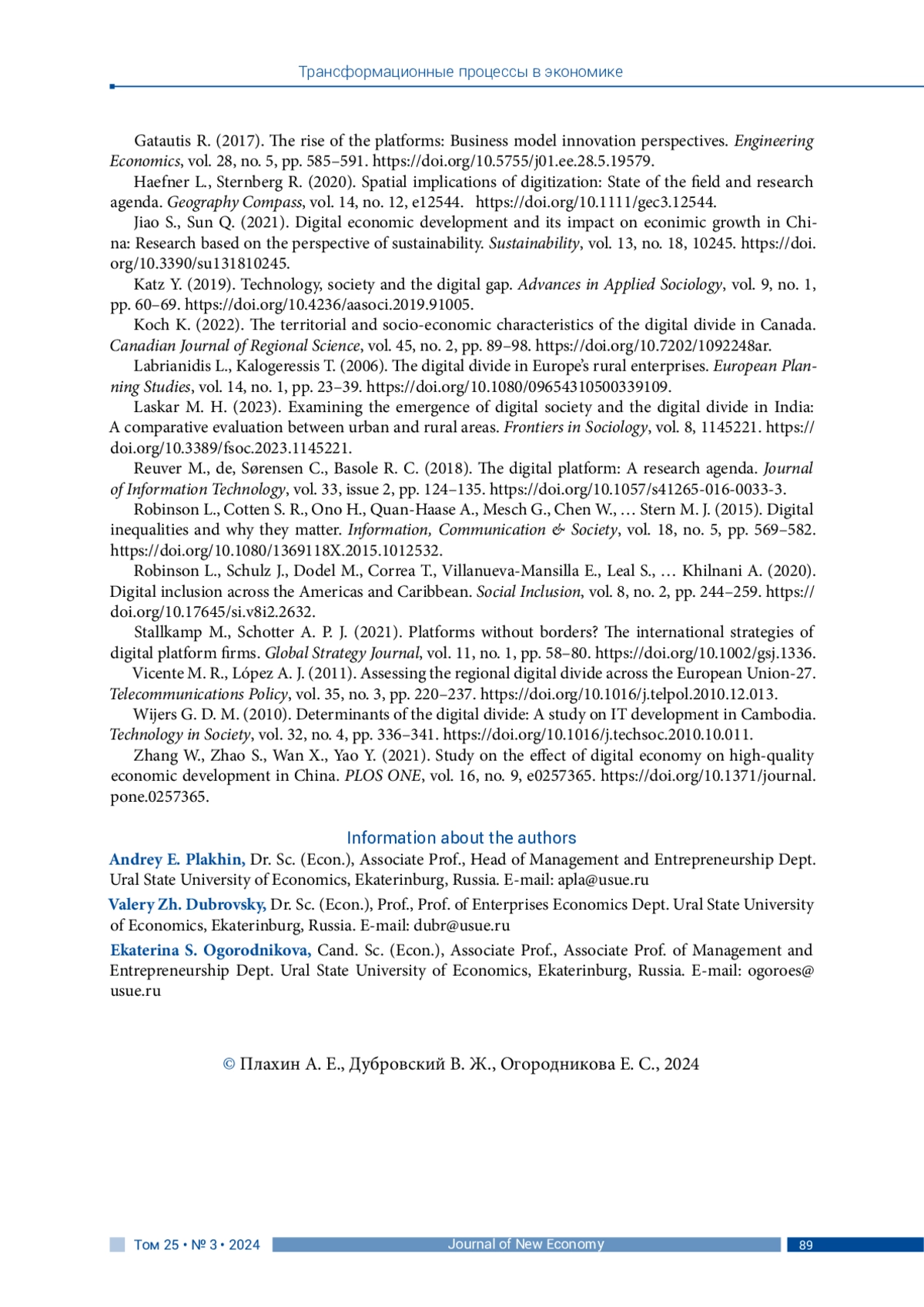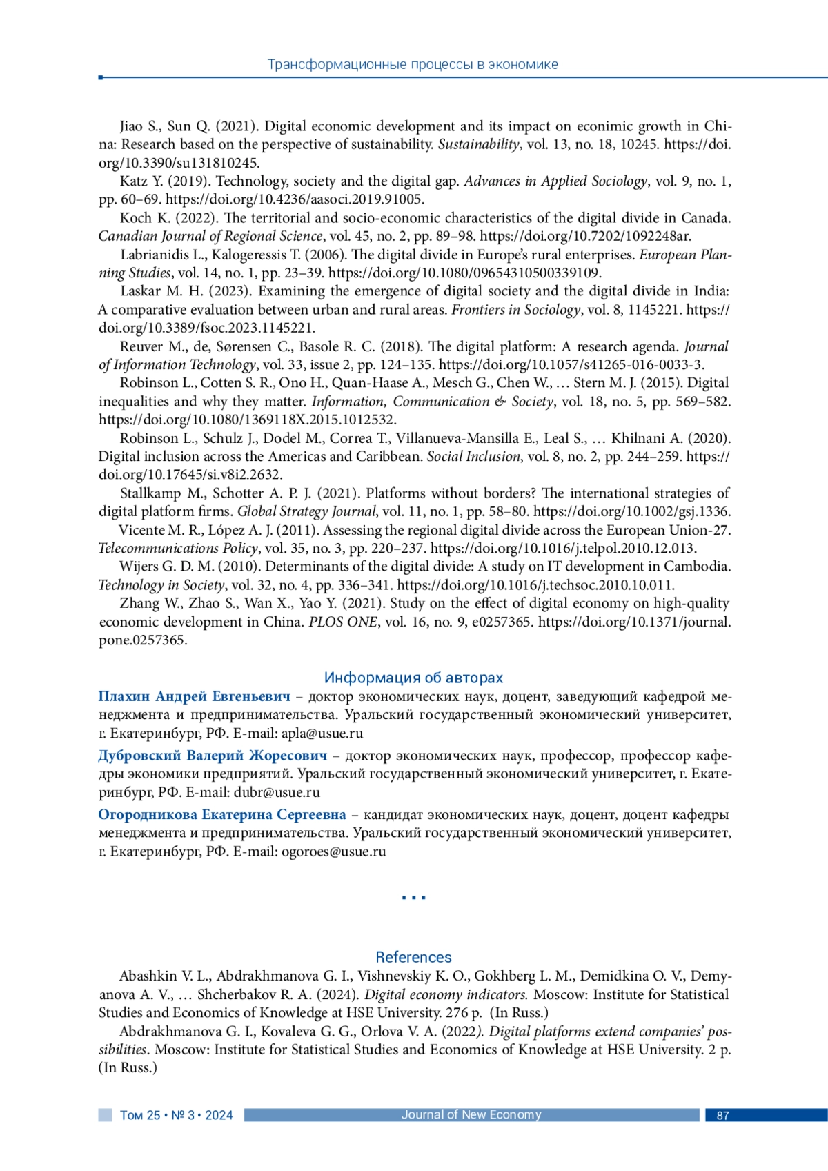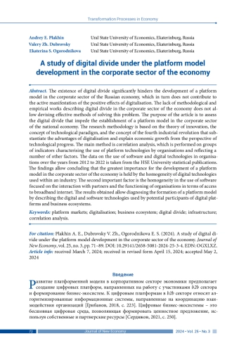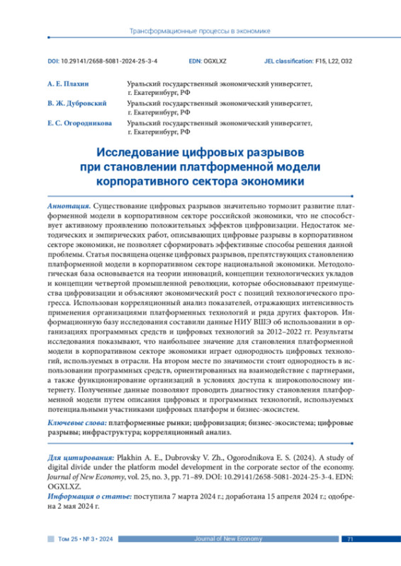 ПЛАХИН А. Е., ДУБРОВСКИЙ В. Ж., ОГОРОДНИКОВА Е. С. ИССЛЕДОВАНИЕ ЦИФРОВЫХ РАЗРЫВОВ ПРИ СТАНОВЛЕНИИ ПЛАТФОРМЕННОЙ МОДЕЛИ КОРПОРАТИВНОГО СЕКТОРА ЭКОНОМИКИ // JOURNAL OF NEW ECONOMY. 2024. Т. 25 № 3