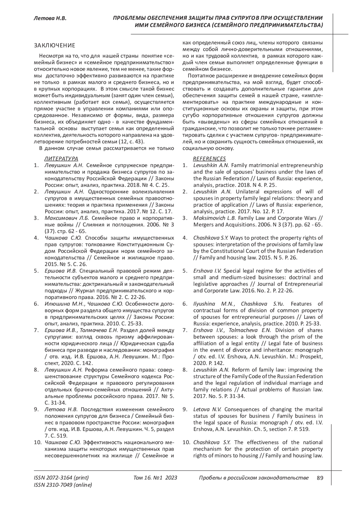 9. Летова Н.В. Последствия изменения семейного положения супругов для бизнеса / Семейный бизнес в правовом пространстве России: монография / отв. изд. И.В. Ершова, А.Н. Левушкин. Ч. 5, раздел 7. С. 519.