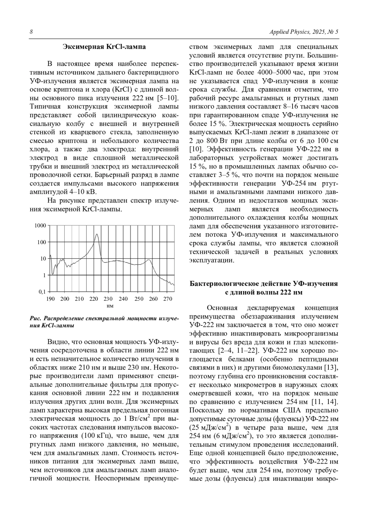Выполнен анализ перспективности применения УФ-излучения 222 нм эксимерных KrCl-ламп для обеззараживания воздуха и поверхностей. Предполагаемые основные преимущества излучения 222 нм, заключающиеся в возможности проводить обеззараживание в присутствии людей, и более высокая бактерицидная эффективность по сравнению с длиной волны 254 нм ртутных и амальгамных ламп низкого давления, проходят экспериментальную проверку. Исследования показывают противоречивые результаты о безопасности такого излучения для кожи и для глаз млекопитающих. Инактивация вирусов и простых бактериологических штаммов УФ-излучением 222 нм и 254 нм достигается при аналогичных УФ-дозах, однако для более крупных объектов (эндоспоры, грибы, гифы грибов) существенное преимущество имеет УФ-излучение 254 нм. Эффективность генерации УФ-излучения 222 нм в промышленных KrCl-лампах составляет 3–5 %, что существенно меньше, чем для ртутных и амаль-гамных ламп низкого давления 30–35 %.