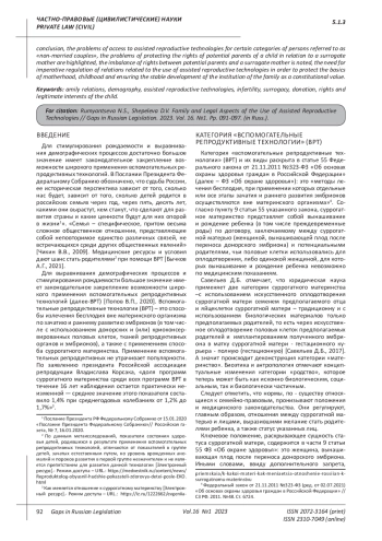 Для стимулирования рождаемости и выравнивания демографических процессов достаточно большое значение имеет законодательное закрепление возможности широкого применения вспомогательных репродуктивных технологий. В Послании Президента Федеральному Собранию обозначено, что судьба России, ее историческая перспектива зависит от того, сколько нас будет, зависит от того, сколько детей родится в российских семьях через год, через пять, десять лет, какими они вырастут, кем станут, что сделают для развития страны и какие ценности будут для них опорой в жизни1 ». «Семья – специфическое, притом весьма сложное общественное отношение, представляющее собой неповторимое единство различных связей, не встречающихся среди других общественных явлений» [Чикин В. В., 2009]. Медицинские ресурсы и условия дают шанс стать родителями2 при помощи ВРТ [Бычков А. Г., 2021].
