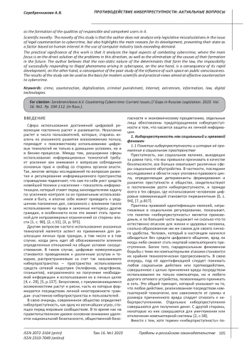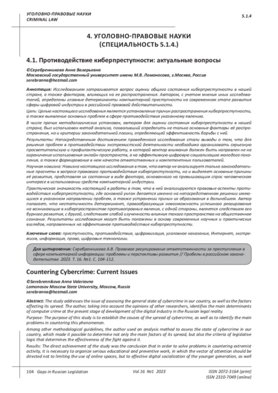 Исследованием затрагивается вопрос оценки общего состояния киберпреступности в нашей стране, а также факторов, влияющих на ее распространения. Автором, с учетом мнения иных исследователей, определены главные детерминанты компьютерной преступности на современном этапе развития сферы цифровой индустрии в российской правовой действительности. Цель: Целью настоящего исследования является установление причин распространения киберпреступности, а также выявление основных проблем в сфере противодействия указанному явлению. В числе прочих методологических установок, автором для оценки состояния киберпреступности в нашей стране, был использован метод анализа, позволивший определить не только основные факторы её распространения, но и критерии законодательной логики, определяющей эффективность борьбы с ней. Результаты: Непосредственным достижением проведенного исследования стали выводы о том, что для решения проблем в противодействии экстремистской деятельности необходимо организовать серьезную просветительскую и профилактическую работу, в которой вектор внимания должен быть направлен не на ограничение использования онлайн-пространств, а на эффективную цифровую социализацию молодого поколения, а также формирование в нем качеств ответственных и компетентных пользователей. Научная новизна: Новизна настоящего исследования в том, что автор не анализирует только законодательные просчеты в вопросе правового противодействия киберпреступности, но и выделяет основные причины её развития, представляя их состояние в виде фактора, основанного на превышающим спрос человеческом интересе в использовании средств компьютерной индустрии. Практическая значимость настоящей в работы в том, что в ней анализируются правовые аспекты противодействия киберпреступности, где основной уклон делается именно на непосредственном решении имеющихся в указанном направлении проблем, а также устранении причин их образования в дальнейшем. Автор полагает, что нестатичность детерминант, правообразующих невозможность успешного реагирования на возникающие в киберпространстве противоправные явления, с одной стороны, является следствием его бурного развития, с другой, следствием слабой изученности влияния такого пространства на общественное сознание. Результаты исследования могут быть положены в основу современных научных и практических взглядов, направленных на эффективное противодействие киберпреступности.
