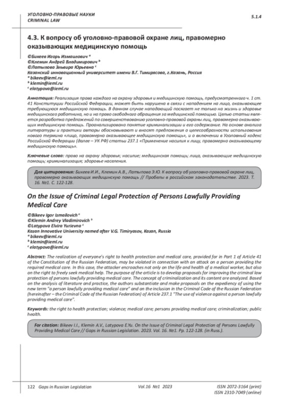 Bikeev I.I., Latypova E.Yu. On the need to criminalize violence against persons providing medical care // Materials of the XVII International Scientific and Practical Conference “Criminal Law: development strategy in the XXI century”. Moscow, 2020: Publishing House: RG-Press. pp. 183-186. EDN: IKSEIR