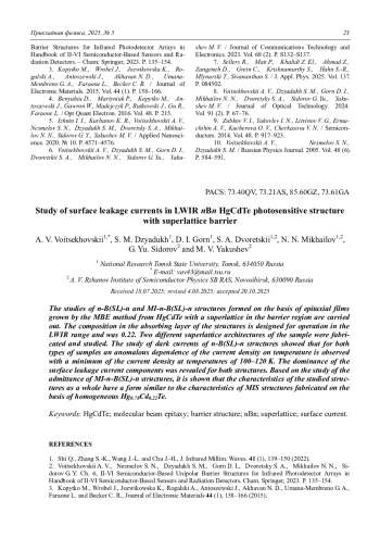 - Voitsekhovskii A. V., Dzyadukh S. M., Gorn D. I., Mikhailov N. N., Dvoretsky S. A., Sidorov G. Yu., Yakushev M. V. / Journal of Optical Technology. 2024. Vol. 91 (2). P. 67–76.