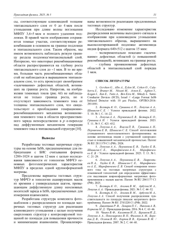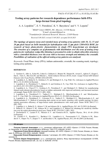 6. Лопухин А. А., Пермикина Е. В., Лаврентьев Н. А., Таубес Е. В., Шишигин С. Е., Мирофянченко А. Е., Мирофянченко Е. В. Способ измерения темнового тока на тестовых матричных структурах с изменяемой топологией для определения эффективности пассивации широкоформатных матричных фото-приемников с малым шагом. Патент № RU 2841177 C1 (РФ). 2025.
