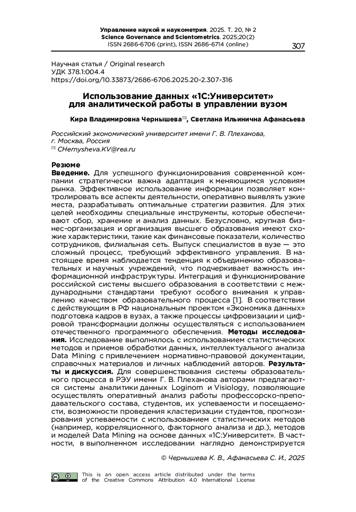 Результаты и дискуссия. Для совершенствования системы образовательного процесса в РЭУ имени Г. В. Плеханова авторами предлагаются системы аналитики данных Loginom и Visiology, позволяющие осуществлять оперативный анализ работы профессорско-преподавательского состава, студентов, их успеваемости и посещаемости, возможности проведения кластеризации студентов, прогнозирования успеваемости с использованием статистических методов (например, корреляционного, факторного анализа и др.), методов и моделей Data Mining на основе данных «1С: Университет». В частности, в выполненном исследовании наглядно демонстрируется возможность преобразования данных ведомостей групп студентов, профилей и направлений подготовки из модуля «1С» в вышеназванные информационно-аналитические платформы, позволяющие осуществлять трансформацию, предобработку данных, проводить оперативный OLAP-анализ, использовать обширный инструментарий c использованием Data Mining методов и моделей, а затем осуществлять визуализацию полученных результатов с построением дашбордов в BI-системе Visiology. Аналитические системы позволяют реализовать все эти возможности посредством подключения напрямую к базам данных «1С» (в случае серверной редакции), либо через использование табличного процессора MS Excel (в случае использования бесплатной версии программного продукта Loginom Community).