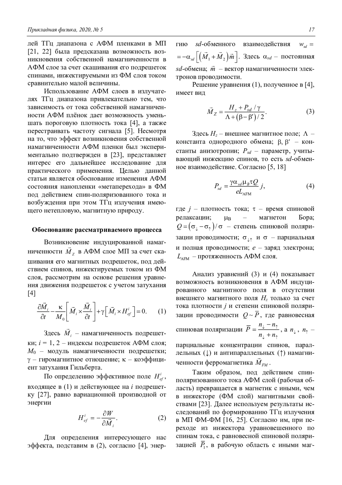 Цель работы – показать возможность возбуждения индуцированной (собственной) намагниченности в антиферромагнитной (АФМ) нанопленке магнитного перехода (МП), а также рассмотреть вопрос его практического применения при создании спининжекционных источников ТГц сигнала. Приведено физическое обоснование рассматриваемого процесса за счет скашивания подрешеток АФМ под действием спинполяризованного тока, инжектируемого из ферромагнитного (ФМ) слоя вследствие sd-обменного взаимодействия спинов электронов проводимости сd-электронами кристаллической решетки. Приведены соотношения для определения частоты и мощности излучаемого сигнала. На примере работы ТГц спин-инжекционного излучателя, использующего «метапереход» с МП ФМ-АФМ, показана практическая значимость рассматриваемого эффекта. Экспериментально показана нетепловая природа излучения в МП ФМ-АФМ на частотах 16 ТГц с уровнем мощности сотни мкВт, а также влияние на процессы в метапереходе внешнего магнитного поля
