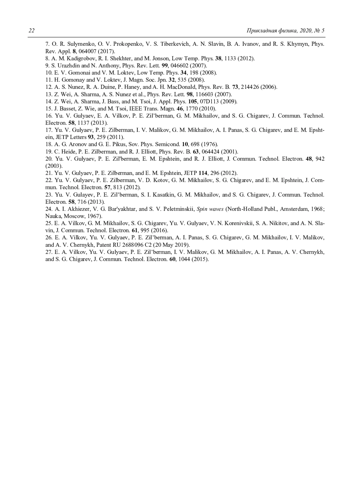 22. Гуляев Ю. В., Зильберман П. Е., Котов В. Д., Михайлов Г. М., Чигарев С. Г., Эпштейн Э. М. // РЭ. 2012. Т. 57. № 8. С. 888.