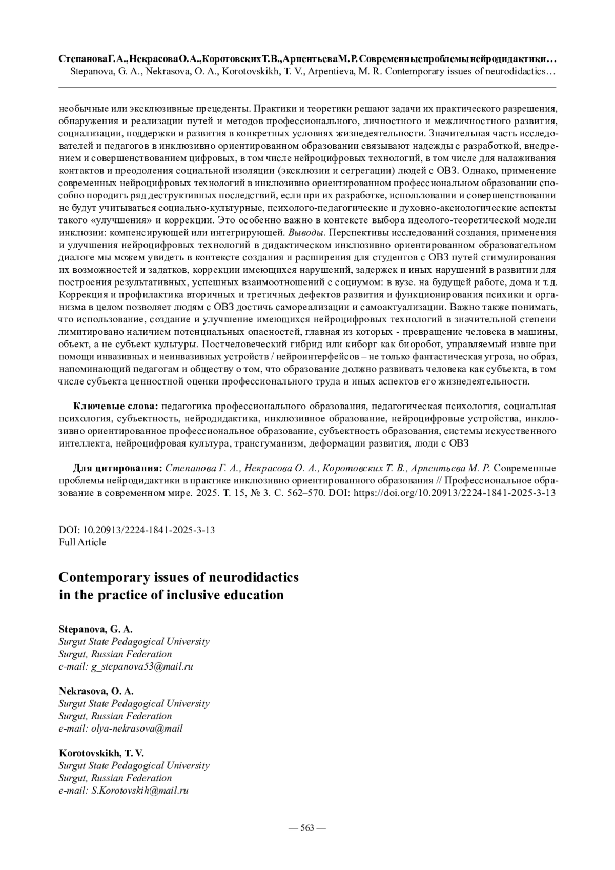 Введение. Проблематика применения, разработки и совершенствования нейротехнологий в современном инклюзивно ориентированном профессиональном образовании, несмотря на свою теоретическую и практическую актуальность, остается малоизученной. Современные исследования практически не рассматривают проблематику современных проблемы нейроцифровых технологий в образовании системно. Исследователями показано, что многие идеи нейродидактики в инклюзивно ориентированном профессиональном образовании на сегодняшнем этапе развития деструктивны: технологиям не хватает процессуальной и идеологической прозрачности и ориентации на основные задачи педагогики как практики поддержки (само) развития человека.